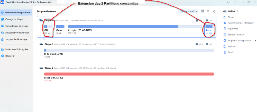 2. Bonjour, Oui j'ai réussi après l'installation d'Easus Partition Manager (Aomei Partion Pro, Macrorit Partition Expert, Minitool Wizard Partition dont l'extension ou la fusion des partitions ne s'activaient pas ...),l'extension de mes partitions à pu être activée et effectivement avec plus de place sur la partition EFI Fat32 du système de 100 Mo à 300 Mo ainsi que la Partition de Sauvegarde Lenovo/Récupération NTFS de 500 Mo à 800 Mo;après redémarrage, la mise à jour Windows 11 64bits version 24H2 a pu s'effectuer sans difficulté !!! Néanmoins ni Microsoft, ni Lenovo n'avait pu trouver la solution, et m'indiquait de formater et réinstaller le Système ! Galère...