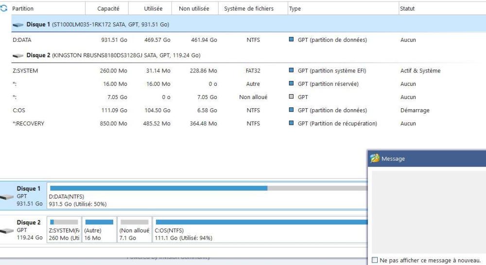 bonjour, merci pour les réponses " supprimer Z et ensuite reduire D et passer Z sur C " j'ai lu que Z " ce disque contient des fichiers de restauration du système et des fichiers temporaires qui ne sont pas dangereux et vous permettent de restaurer vos versions précédentes de Windows. Et parce que ce disque ne prend que peu d'espace, essentiellement des centaines de Mo au maximum, il est généralement recommandé de le laisser là " ; donc vu la petite place qu'il occupe, c'est mieux de le conserver ? je veux seulement étendre C, mais minitool ne me propose que de l'augmenter de 7 Go ça serait parfait si je pouvais diminuer D ( 931 Go ) et rajouter 100 Go à C, mais minitool ne le propose pas . Les autres logiciels easus et amoei ont buggé. Bref, je suis en panne Je ne suis pas pro; je ne veux pas fusionner les partitions ni prendre la place d'un disque sur l'autre ( c'est trop compliqué vu mon niveau ! ) voila la pj de minitool merci -