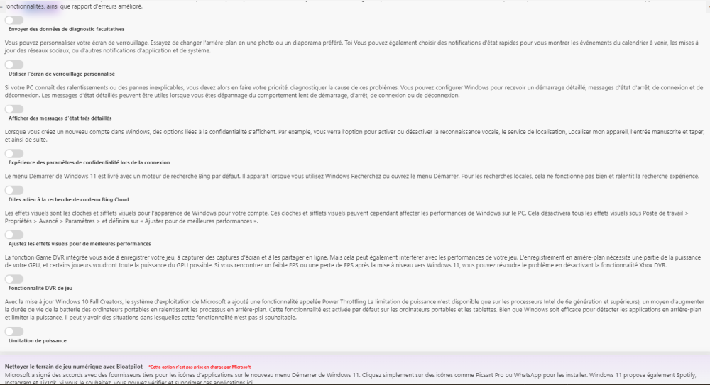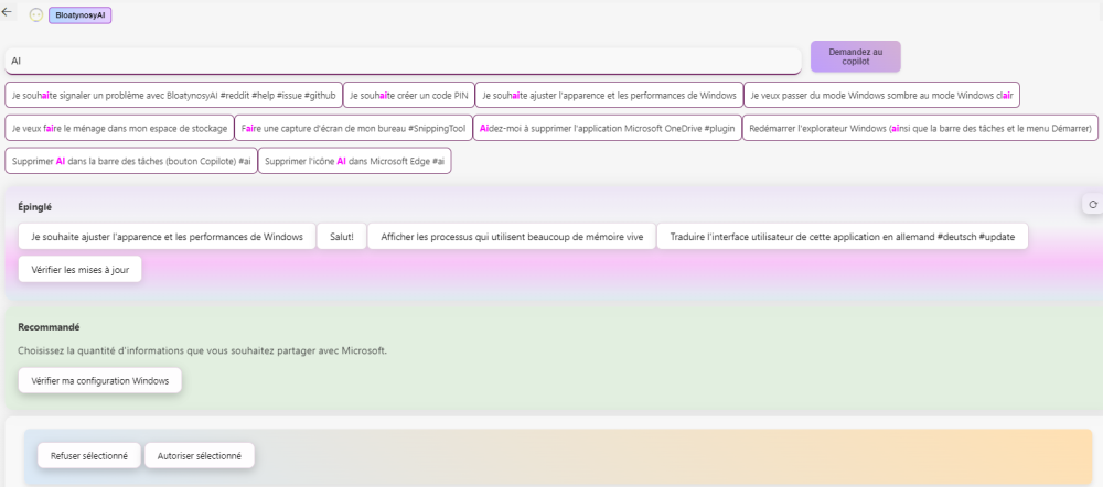 bonjour, merci beaucoup pour cette précision oui, c'est ce qu'on demande : de désinstaller " toutes les fonctionnalités de Windows qui utilisent l'IA" c'est déja plus simple pour ceux qui ne sont pas informaticiens d'utiliser ce logiciel . les autres manipulations manuelles ne sont pas faciles à comprendre et à maitriser. en résumé, toute l'AI est bloquée ... est-ce que la liste des choix que j'ai fait pour bloquer l'AI est compléte ? Cordialement, -