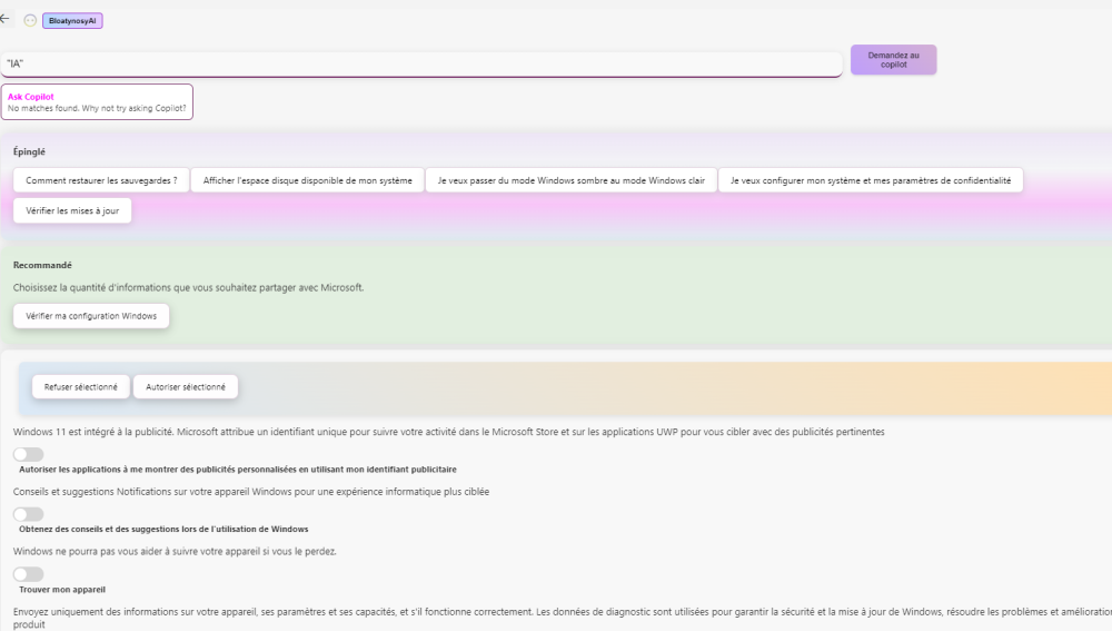 bonjour, j'ai pu installer le logiciel grâce à votre réponse, merci ça donne les résultats en PJ : les résultats des éléments bloqués sont ils suffisants ? Si ça bloque Recall , est-ce que ça bloque aussi copilot ? Aprés l'utilisation du logiciel , j'ai trouvé dans les paramétres les infos suivantes pour windows AI et copilot ; la valeur est bien toujours sur 1. en pratique, est-ce qu'il faut refaire ce programme régulierement , à chaque ( petite ) mise à jour de windows update , etc .. ou c'est bien bloqué en permanence ? -
