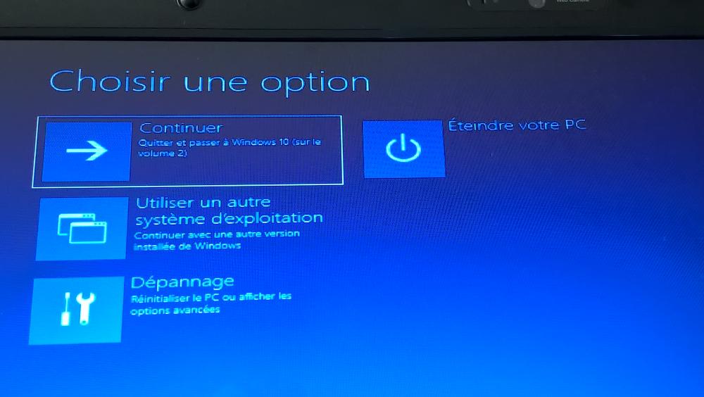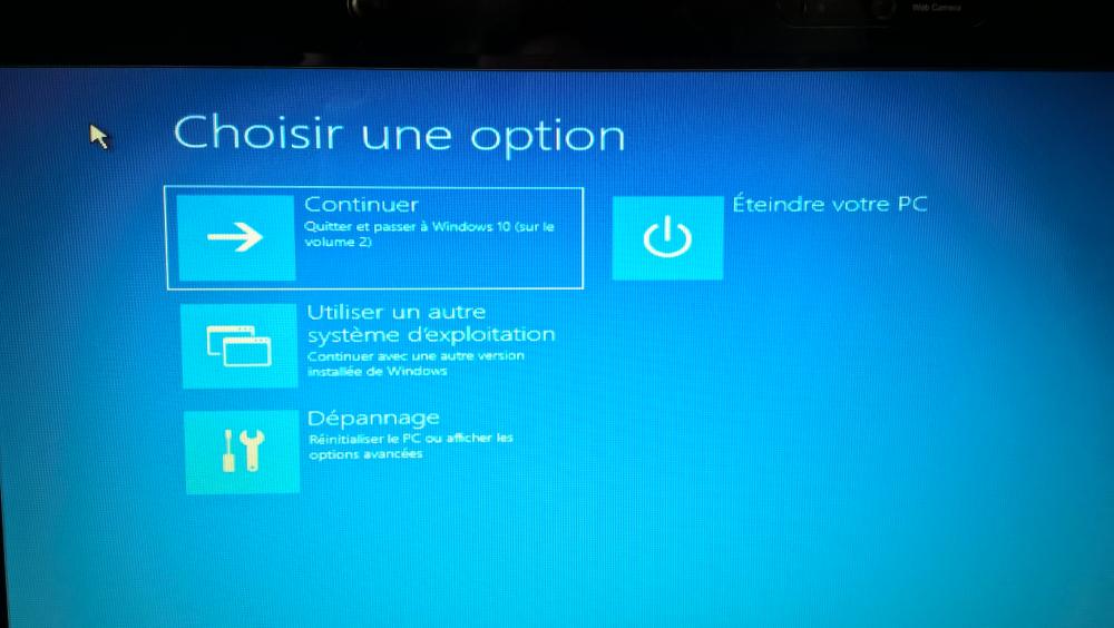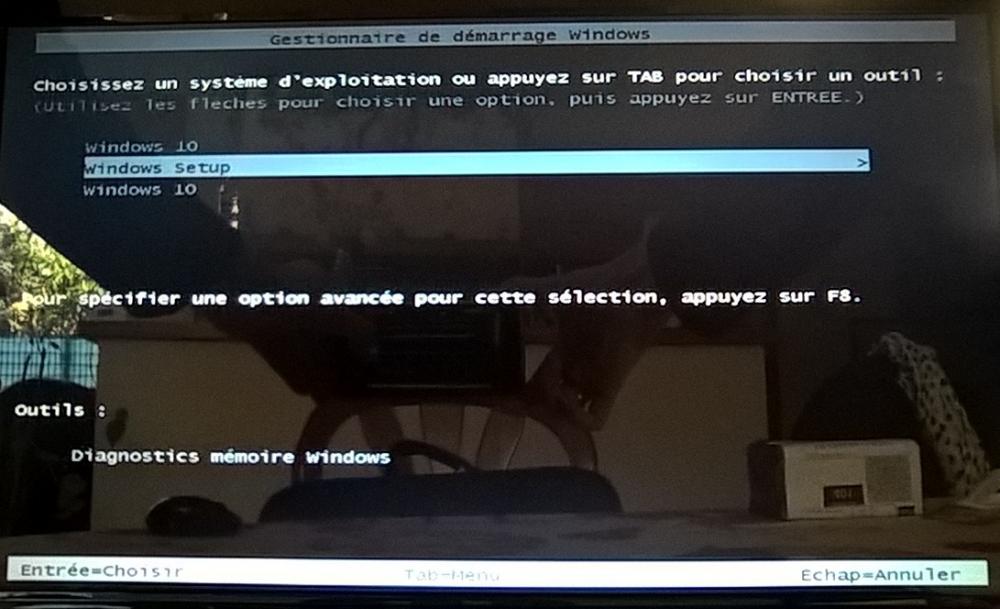 1er choix du menu : Windows 10 -> je reviens au démarrage de l'ordi, avec le petit curseur qui tourne sans cesse (photo 6 et 7) puis retour à la case départ... 2ème choix du menu : Windows setup -> je reviens encore au démarrage de l'ordi puis j'ai un écran bleu qui s'affiche avec le choix de la langue, (photo 8) et ensuite, j'ai ce menu (photo 9)