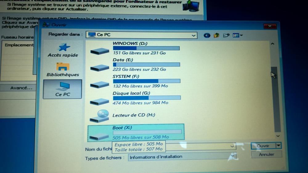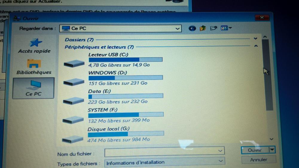 Pc Toshiba Satellite L670-14E (PSK3EE-01C007FR) avec Windows 7 Home Premium 64 bits (pré-installé - Toshiba HDD recovery) Processeur intel Core i3-330M - Disque Dur 500 Go - ATI Mobility Radeon HD 5650 avec Technologie HyperMemory 4096 (2048 + 2048) DDR3 RAM (1066 MHz) Bonsoir à tous ! Début Février : Premier souci : Mon mari surfait sur le net et il est resté coincé sur cette fenêtre (Photo 1) J'ai cru que c'était un virus, donc il a eu le droit de se faire gronder. Puis, je lui ai conseillé de faire des mises à jour de son anti-virus puis de Windows. Et c'est là que le bazar a commencé. J'ai tout fait moi-même, le pc a démarré plusieurs fois pour effectuer toutes les MAJ puis nous l'avons rangé. Quelques jours plus tard, impossible d'accéder à Windows. Il me demandais de choisir une langue, puis j'ai eu ce type d'écran : (Photo 2) J'ai essayé tous les choix, je n'arrive à rien J'avais fait une clef USB de sauvegarde d'image système (Win 10) mais çà ne fonctionnait pas non plus. J'ai essayé de ré imager l'ordi, pas de succès de ce côté là non plus (Photo 3) Je peux continuer longtemps comme çà car j'ai photographier toutes mes manips J'ai même essayé de récupérer Windows 7 sur le site de Microsoft, j'ai eu le droit à un beau message d'erreur : (Photo 4) En refaisant la manip (une fois connectée à un compte Microsoft ), j'ai eu un autre message d'erreur : Nous avons rencontré un problème avec votre demande. Veuillez consulter la page Contactez-nous du support Microsoft pour obtenir de l’aide. Indiquez le code de message 715-123130 et l’identifiant de transaction cd30baf7-e71c-4b9d-8f53-b8ee24140d31. En bref, je suis coincée, j'ai parcouru ce forum sur beaucoup de tutos qui m'ont énormément aidé, et je remercie @Le Crabe d'avoir répondu à mes premières questions car je ne savais pas par où commencer mon sujet. J'espère aussi avoir été très claire parce que j'ai l'impression de lire beaucoup de problèmes similaires au mien sans trouver de quoi m'aider. Au plaisir de vous lire ! Bonne soirée à tous