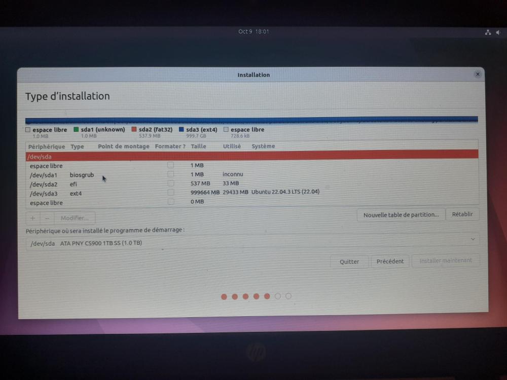 Puis j'ai relancé l'installation de Ubuntu à partir de la clé et avec un disque vierge