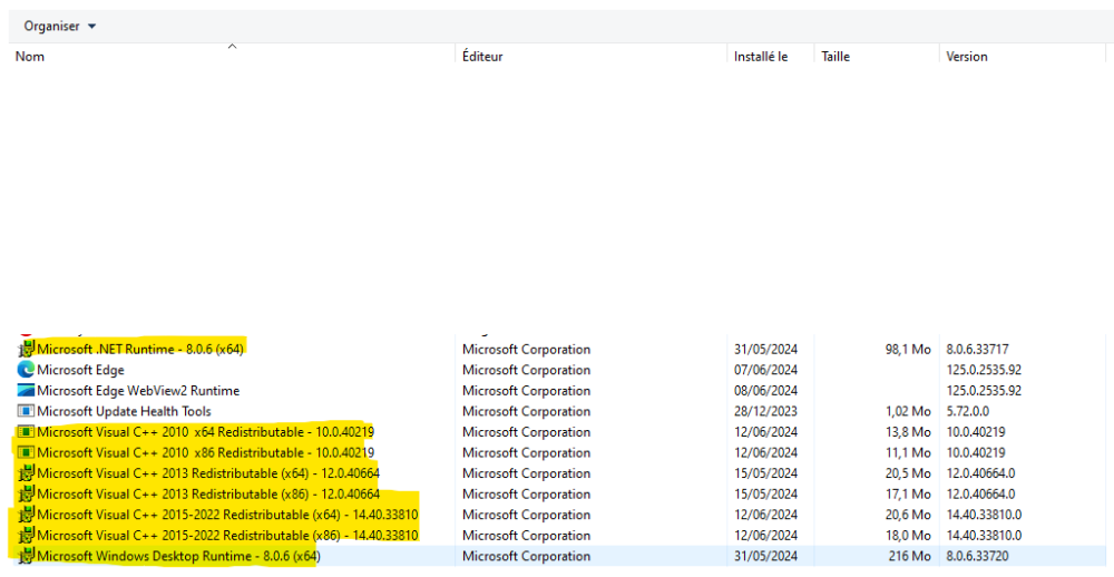 18. Je passe par là car j'ai vu Captvty affiché :p je l'utilisais tellement quand il fonctionnait avec M6 ^_^ Perso, je n'ai pas de .NET Framework 4 et je suis sur Windows 11. Ce que je te conseil : - faire impérativement tes mises à jour Windows, ça peut paraitre bête, mais certains ne les font pas, après ils ont des soucis, avec WU ça règle beaucoup de soucis - ensuite dans la liste des programmes, supprime tout ce qui est lié à .NET et Microsoft Visual tel que : Microsoft .NET Framework, Microsoft .NET Runtime, Microsoft Visual C++ 2010 à 2022 comme ici : Ensuite, tu redémarres, dès que tout est propre et bien ranger. On va commencer à télécharger (pour Windows 7 / 10 / 11 64 bit) : - Microsoft Visual C++ Redistributable 14.40.33810.0 (dernière version en date du 14 juin 2024) - .NET Desktop Runtime 8.0.6 - .NET Runtime 8.0.6 On redémarre et on essaie. Personnellement j'utilise ces 3 applis provenant de chez Microsoft et pour le moment, aucun logiciel ne fonctionne pas, idem pour Captvty 2 / 3. En espérant avoir aidé !