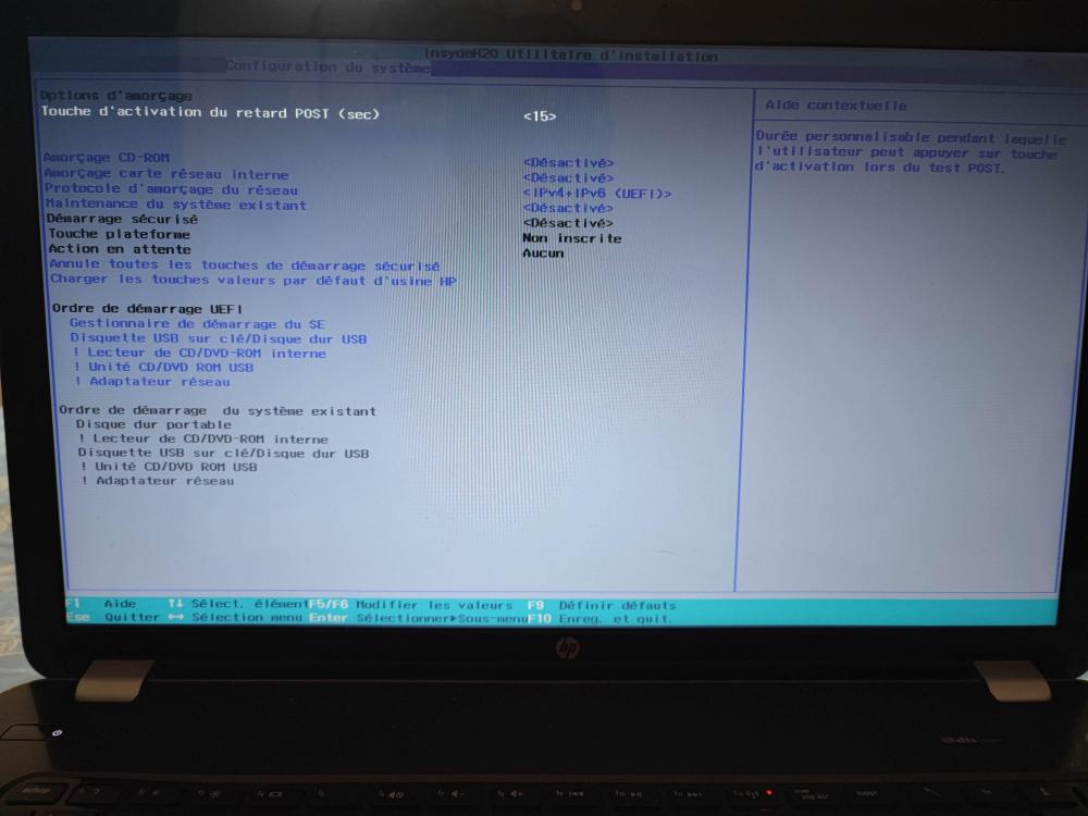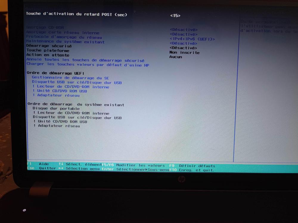 Re, J'ai changé la touche d'activation du retard à 15 secondes, et j'ai désactivé l'amorçage CD Rom. Voici la copie écran demandée. Par contre quand je redémarre la machine en tapotant F9 il me propose bien le bootmenu mais lorsque je sélectionne le gestionnaire SE c'est W10 qui démarre. Voilà la copie écran demandée. Au plaisir de te lire, Kh38