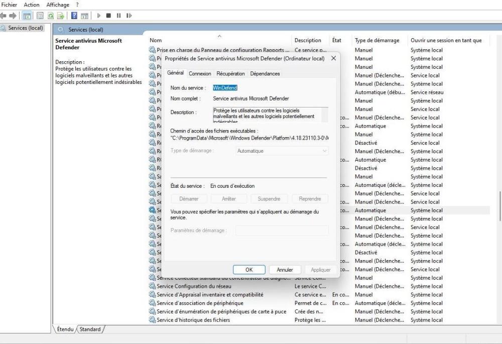 Dans "services.msc", tous les services liés à windows defender sont grisés et donc non modifiables. Je vous mets une capture d'écran.