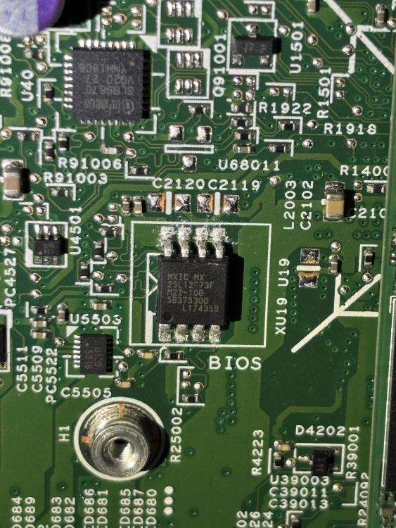 @Delta J'ai pu prendre une photo de la puce avec mon téléphone, je vous laisse y regarder mais il y a beaucoup de choses écrites dessus je ne sais pas vraiment où est le numéro de série dans tout ça. Je rajoute une photo de la CM de cet ordinateur que j'ai pu trouver sur internet, la puce en question est encadrée en rouge.