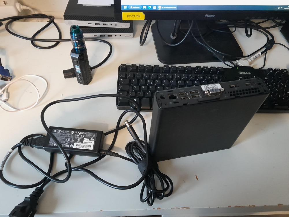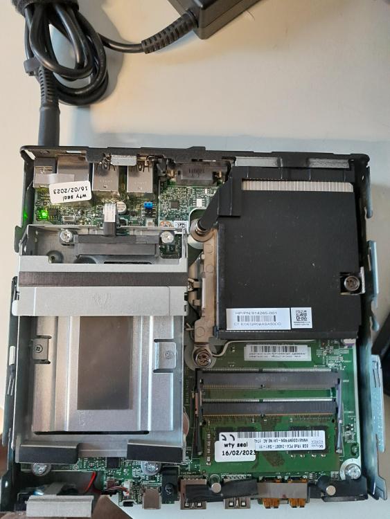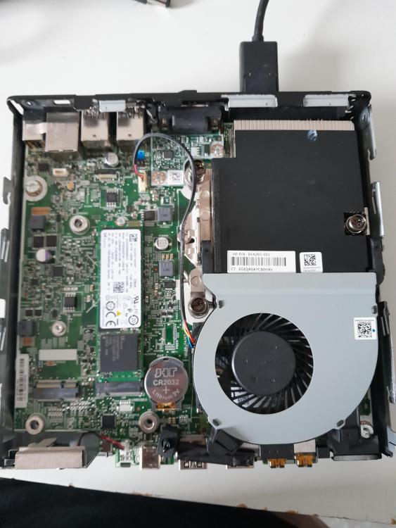 23. alors c'est des mini pcs donc je n'ai pas d'alim à proprement parler, je vous joins une photo pour montrer ce que c'est, c'est des HP EliteDesk 800 G3 mini. Quand je parle d'alim, je parle donc du câble d'alimentation de l'ordinateur. Vous pourrez également voir les LEDs qui s'allument sur la carte mère, il y aura donc deux photos, une pour chaque ordinateur. Sur la première photo, on peut voir que la LED à coté du ventilateur est allumée lorsque je branche l'alimentation. (J'ai levé le ventilateur pour que la LED se voie bien sur la photo, sinon ça ne se voyait pas) Sur la deuxième photo, on peut voir que c'est une autre LED qui est allumée et celle qui est censée être à côté du ventilateur ne l'est pas. (Sur le premier poste, celui donc la LED à côté du ventilateur est allumée, la LED qui est allumée sur le deuxième poste s'allume seulement au branchement de l'alim puis s'éteint juste après). Je tiens également à préciser que le poste dont la LED à côté du ventilateur est allumée est celui dont la LED du bouton d'allumage s'allume lorsque j'appuie dessus, ce qui n'est pas le cas de l'autre poste. Et ce sont bien des postes du même modèle.