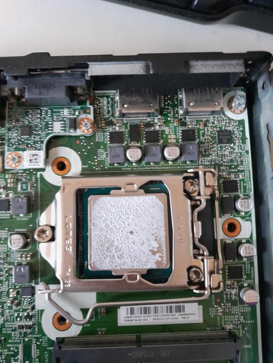 16. @Delta J'ai bien démonté tous les éléments qui me cachaient la vision sur les condos, et je n'en ai pas vu de gonflés. Par contre, en retirant les ventirads sur les deux, j'ai vu deux choses bien distinctes : - Un dont la pâte thermique avait coulé sur le circuit imprimé du processeur - Un dont il y avait peu de pâte thermique (Je fournis bien sûr les photos ci-dessous) Concernant un changement de processeur, je ne sais pas si j'en ai d'avance. E+t si j'en ai, s'ils fonctionnent..
