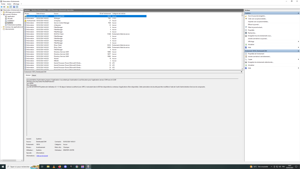 Bonojour a tous, j’essaie de régler mon problème tout seul depuis déjà un mois. forcé de constater que je n'y arrive pas. je suis sous Windows 10 mon pc redémarre tout seul. j'ai testé la ram pas de soucis, les ssd pas de soucis, j'ai poussé la GPU et le CPU a fond par de restart pendant les tests.. sachant que mon pc peut rester allumer 12h sans redémarrer et fonctionner normalement, il peut aussi redémarrer 10 fois de suites ou toute les 20 minutes..... je ne trouve pas de corrélation non plus avec des logiciel qui pourrait créer un conflit. j'ai testé de tout désactiver mais rien ne m'oriente vers une piste. je précise que je n'ai pas de BSOD avec un code d’erreur. juste le pc redémarre. mon poste est tout décousu je m'en excuse, je pars dans tout les sens.. en ce qui concerne les erreur critiques que j'ai pu relever je joint une photo . peut être l'alim ?? je ne sais pas. si quelqu'un veut bien m'aider a plonger dans ce bordel c'est avec plaisir que je lui donne d'autre infos.