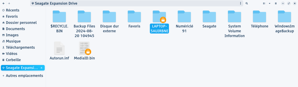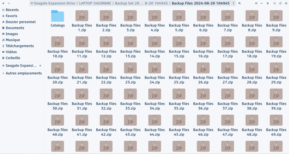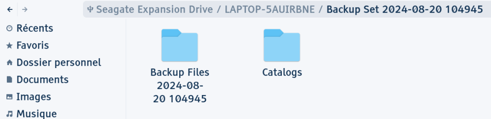 Mon disque dur externe comporte plusieurs dossiers qui semblent avoir été créés avec la sauvegarde que j'ai faite : "LAPTOP-5AUIRBNE" (c'est le nom de mon ordinateur) et "Backup Files 2024-08-20 104945" (ce qui correspond à la date à laquelle j'ai faite la sauvegarde). Dans le premier il y a : un fichier .ini, un fichier .bin, et un dossier intitulé "BackUp Set 2024-08-20 104945" qui, lui comprend deux dossiers, un nommé "Catalog" et un autre "Backup Files 2024-08-20 104945" (qui porte donc le même nom que le dossier général, le deuxième dont je vous parlais). Dans ce tout dernier dossier, il y a beaucoup, beaucoup de dossiers .zip qui, quand je les ouvre, comportent chacun de nombreux fichiers (mais je n'arrive pas à les ouvrir) Dans le second, il n'y a rien. (J'ai essayé de mettre des captures d'écran avec mon message mais je ne vois pas de trombone comme indiqué dans le tutoriel, et je ne peux pas coller d'image ici visiblement...)