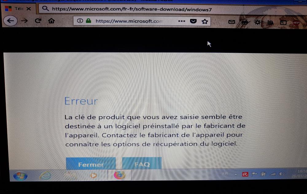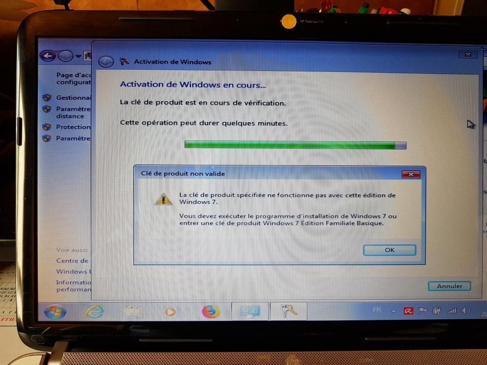 Bonjour à tous , Le PC est réinstallé et à jour ( quasiment 200 MAJ mais c'est normal ) mais impossible d’activer la clé qui refuse celle existante et d'origine sous prétexte que ça n'est pas le bon Windows alors qu'au départ c'était bien W7 .. coup fil à Microsoft et là ça s'envenime un peu vite car l'interlocuteur me dit d'aller chercher la bonne image ISO ( je n'ai pas l'intention de tout réinstaller bien sur ) le type n'a pas voulu me dire que celui-ci n'allait plus être pris en charge ! une petite idée ou je reste comme ça ?