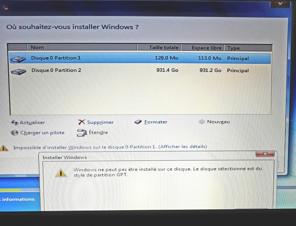 Bonjour à tous , encore moi . Je crois que c'est la grande brasse pour installer Windows , au départ ce PC de 2012 était sur W7 avec migration sur W10 en 2016 sur lequel le PC avait planté et maintenant après avoir été cherché l'image ISO W7 voici la photo de ce qui est affiché ! aurais-je fait une mauvaise manip' ? au fait j'ai fait F9 et boot sur DVD mais pas grand chose ne se passe .. Une idée ? Merci à vous , sinon bon week end.