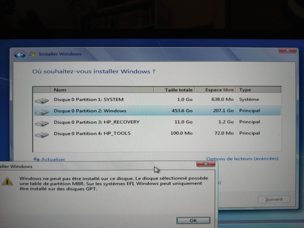 20. Hello Merci pour votre réponse. Mais j'ai peur de ne pas avoir assez de mémoire: le Disque dur principal qui contient windows et tout le reste fait 651 Go. L'installation actuelle prend 453 Go, ce qui fait qu'il ne reste plus que 198 Go de disponibles, pas assez, me semble-t-il. C'est un vieil ordi, ils n'avaient pas de gros disques durs. C'est pour ça que j'envisage, au cas ou on ne puisse pas réparer le démarrage, de faire une réinstallation complète en choisissant "Personnalisé", c'est à dire, en effaçant tout en même temps qu'on réinstalle. J'ai essayé, mais il ne veut pas rester sur personnalisé, il veut tout conserver, mais ça passera pas, il n'y a pas assez de mémoire. La clé bootable en GPT, c'est pas moi qui l'ai faite, c'est le vendeur, moi j'en ai pas. Créer une clé bootable au bon format, je veux bien, mais n'oubliez pas que le PC ne démarre plus ! Comment faire ? Je ne peux plus naviguer dedans... Quand j'installe, au moment ou il montre les partitions, on peut afficher, en dessous, des outils dont un qui s'appelle FORMAT. Est-ce qu'avec ça je ne pourrais pas formater la partie windows en GPT ?