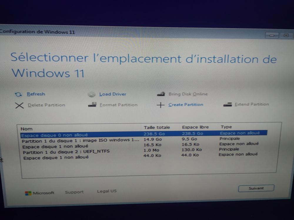 9. Good question, j'ai finalement effacé ligne par ligne ce qui était éffacable, certaine ne l'était pas, j'ai mis en surbrillance la seule ligne qui permettait de crée une nouvelle partition et j'ai suivi vos conseils: next, next... Là il m'a dit rebrancher internet, il fait les mises à jour ... Ca a l'air de fonctionné, je confirme une fois windows lancé sans la clé