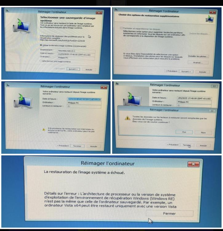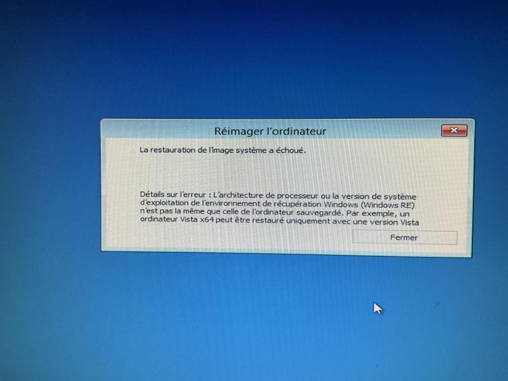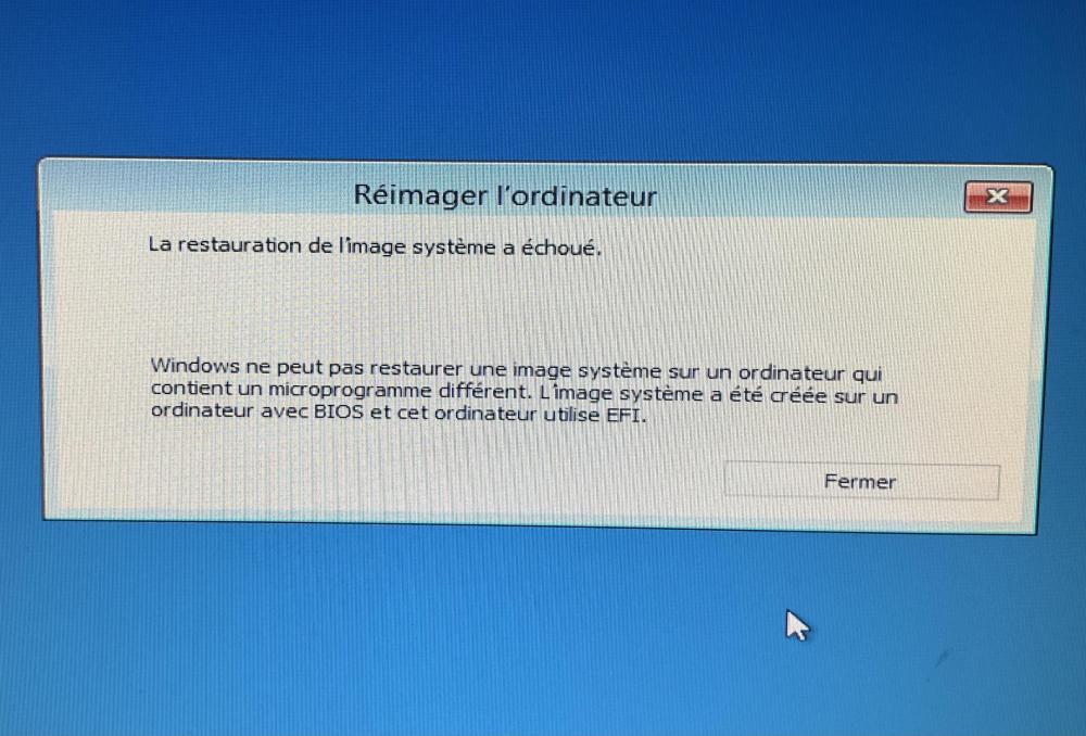 je suis musicien, mon pc est sous Windows 7. Parce que mon imprimante est morte et que la nouvelle ne marche qu’avec Windows 8.1 minimum, je décide donc de passer à Windows 8. Mon fils me charge Windows 8 sur une clé usb, il me donne une clé d’activation. Préalablement, je fais une image complète de w7 qui est stockée sur un de mes deux disques durs internes. Après le démarrage de w8, je ne retrouve plus rien, je travaille habituellement avec 2 écrans, là, un seul s’allume…bref, je décide de faire un Come back à w7. J’ai suivi à la lettre vos instructions et à la dernière phase, juste avant de démarrer la restauration de l’image : c’est le drame. Il ne veut pas. Je vous glisse un screenshot de son message. J’espère que vous allez pouvoir m’aider. Merci.