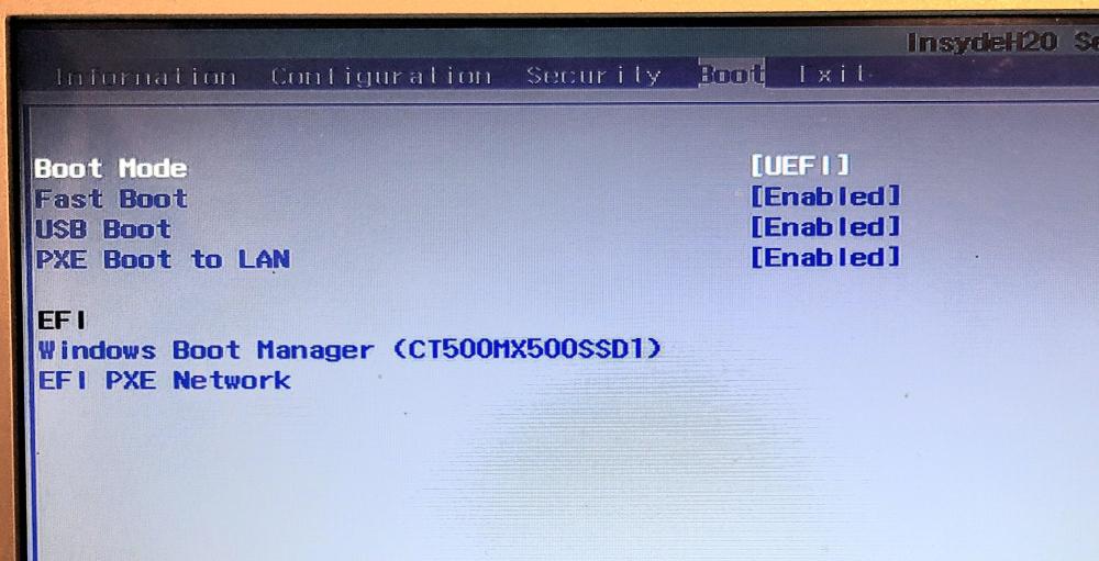 Bonjour Delta. J'ai désactivé le secure boot bien sur pas comme sur la photo. Je peux désormais avoir aacces au bios soit par f2 soit par les tuiles bleues. Mais ma clef avec Rufus fait 982gb et sans doute le pc n'aime pas la voir en usb 3. Je pense acheter une clef de 32 gb et réinstaller rufus et l'os dont je ferai une image pour vous avant de la relancer . Mais après cela dites moi ou je pourrai voir ma clef dans le bios Merci