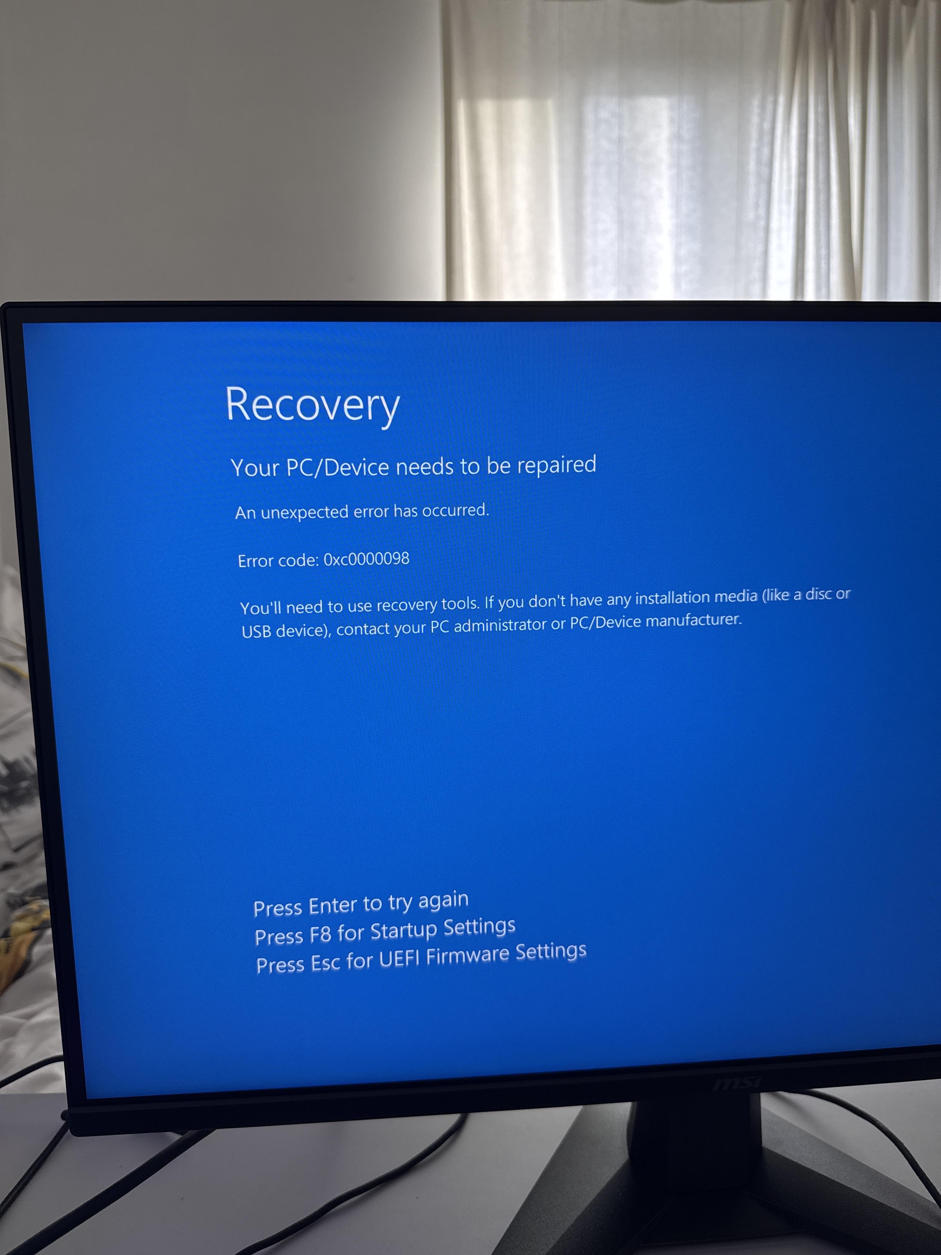 J'ai essayé donc d'installer windows 11 mais nouveau blue screen (voir image 1 - erreur 0xc0000098) et dans le menu f8 (voir image 2) chaque option ne font rien et me renvoient à la première page du blue screen.