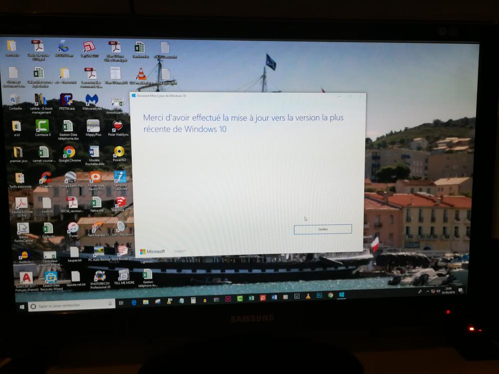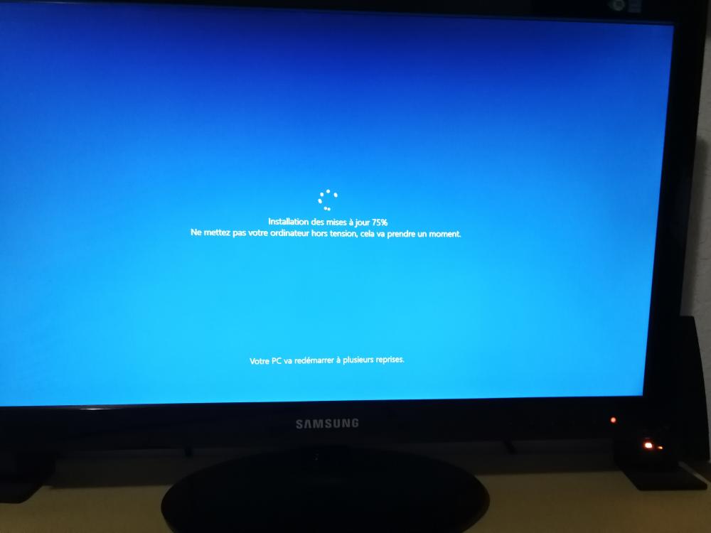 bonsoir, J'ai pas voulu attendre, j'ai trouvé et installé la dernière mise à jour sur le site microsoft. J'ai eu un blocage lors d'un redémarrage, écran noir, j'ai attendu les 3/4 du match Réal vs Bayen. J'ai forcé l'arrêt. J'ai pris le tournevis et déposé la carte wifi. A savoir que lors de ma maj de w1511 vers w1709 j'avais du enlever cette carte. La 1 photo après le redémarrage, comme pas de carte wifi, pas de web pour communiquer avec microsoft. J'ai re-redémarré, après avoir remis la carte wifi, la mise à jour est repartie de 75 % sans s'arrêter Bien me voilà avec cette nouvelle mouture ......... A+