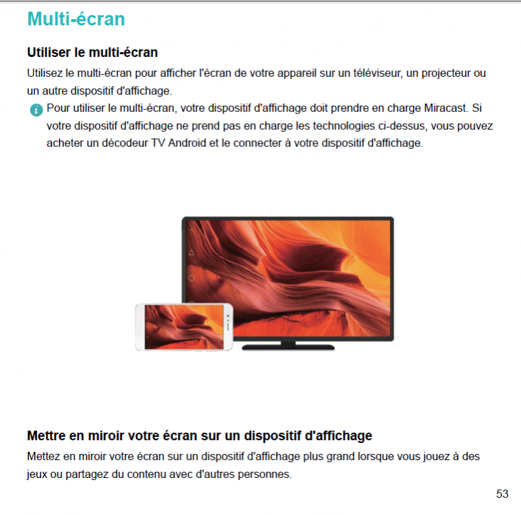 14. Bonsoir, j'ai essayé plusieurs options. La box ne m'intéresse plus: le triplay niet, les chaines TNT me suffissent, sauf cas présent bein. Le tél adsl, non ! je préfére le mobile. Je reviens sur mes essais. J'ai acheté chez boulanger le Chromecast: pas possible d'établir une connexion avec la télé. Le vendeur, compétent, a compris de suite: le téléphone peut pas être en même temps: Wifi et point accès mobile. J'ai également acheté le câble USB c, là encore pas de possibilité pour la télé. Il parait que le décodeur Androïd pourrait faire l'affaire ? Ci-joint une partie doc du tél Miracast n'est pas pris en charge par ma télé. Je vais étudier tes solutions Cordialement