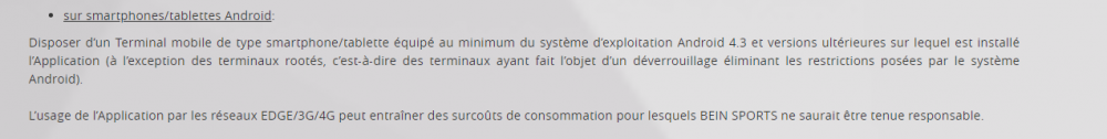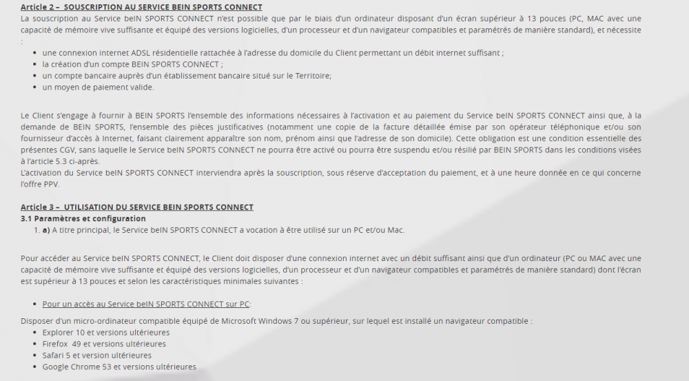 1. En fait je voulais réduire le pied du message précédent, je le trouve bien grand. Pourquoi ne pas pouvoir supprimer le dernier message sans suite ? Je reviens sur lecture Pc suite essai samsung S3, je suis passé samedi par la hotline de Bein, j'ai eu leur message d'accueil et de souscription dans la boite spam. Donc j'ai découvert ce n° gratuit pour SAV. La personne m'a guidé suite à mes soucis. -- aller dans le navigateur google sur les 3 points verticaux > paramètres > paramètres avancés > effacer les données de navigation > clic > sélectionner la colonne droite paramètres avancés > sélectionner tout sauf: cookies et autres données de site et autre mots de passe, valider. -- Toujours dans paramètres avancés Réinitialiser et nettoyer réinitialiser > clic > valider Redémarrage et reconnection à bein - voilou l'image noire qui charge le tampon et voici le match En ce qui concerne Bein: Ci-joint plusieurs captures - l'offre sur le site, bien voir en bas gauche encadré rouge GGV. Capture de 2 passage - vous devez avoir une connection adsl résidentielle pour les pc. - vous devez joindre la preuve de l'installation fournie par l'opérateur à savoir c'est de l'administratif: ils demandent rien et si vous validez la coche, vous n'avez pas droit à la rétractation. Vous êtes connecté de suite, après il faut assumer. De plus c'est un peu vieillot car la -- 4 G+ plus wifi --- est parfois meilleure que le câble ethernet, du baratin ! Concernant les smartphones et tablettes elles ne sont pas reliés par câble mais bien par Wifi, donc c'est non et oui Conclusion finale: Comme vu plus haut le Samsung S3 est meilleur que le Huawei P 10 pour la réception de bein sport Partant que Samsung est bien n° 2, j'ai acheté le S 9 et fait l'essai hier soir. L'image est parfaite, sans coupure. De plus en connectivité: Je peux le relier à l'ordi en HDMI et de même au téléviseur. J'ai pas encore le câble ! ça va pas traîner ............. Salut à tous