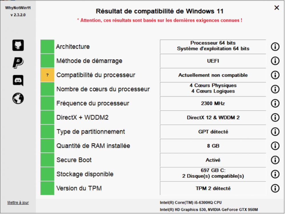 Bonjour, Peu t'on sérieusement envisager la migration vers W11 en changeant le processeur de son portable. J'ai fait l'analyse de mon pc avec l'application WhyNotWin11 (trouvé sur le site du crabe) et ci-joint le résultat + désignation du processeur Merci et à plus