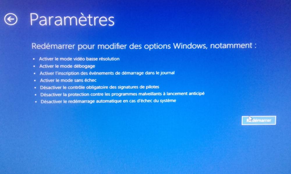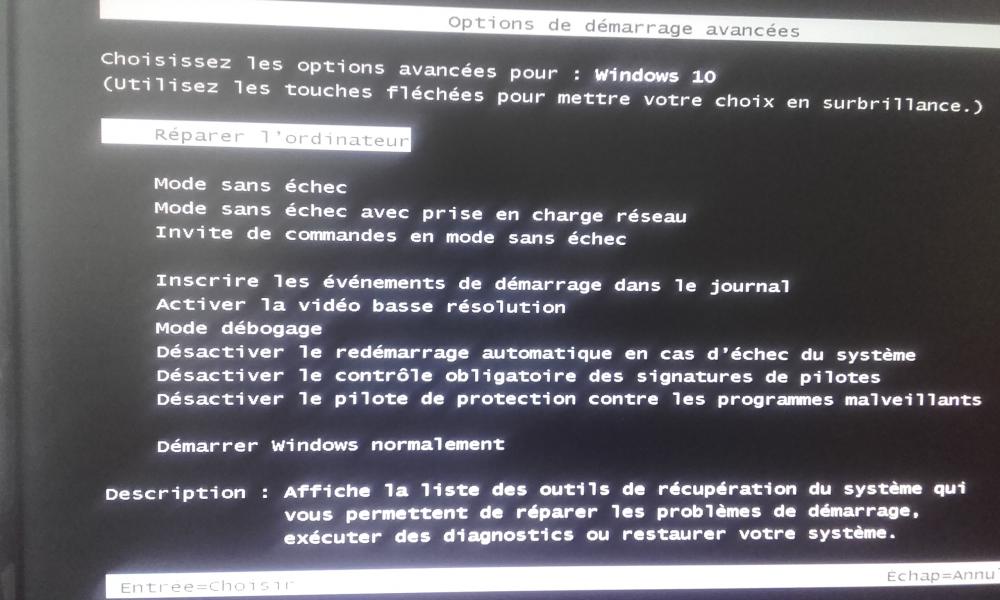 4. Bonjour à tous Suite à une MAJ WINDOWS 10 d'avril 2018, mon PC présente un ecran noir , suite à une modification des pilotes par WINDOWS 10. J'arrive à aller sur la page d'accueil de W10 ou je dois indiquer mon code d'accès et ensuite il n'y a que le curseur de la souris. Comme vu dans un de vos articles (pb carte graphique) , j'arrive à redémarrer mon PC pour aller sur la page MODE SANS ECHEC , (voir photos) mais ensuite je reviens à la page d'accueil (ICONE WINDOWS en bleu au lieu de grisé) comme initialement. L'accès au MODE SANS ECHEC ne fonctionne pas... j'ai pourtant conservé le minimum de périphériques. J'ai un ancien PC assemblé sous W10 32 bits 4 Go qui fonctionnait bien jusque présent. Ma carte graphique est certes ancienne mais pour mon usage cela me suffit. J'ai testé la restauration de mon PC à une date antérieure, mais cela plante FIREFOX et bon nombre d'outils MICROSOFT ne sont plus à jour... Merci de votre aide. Olivier