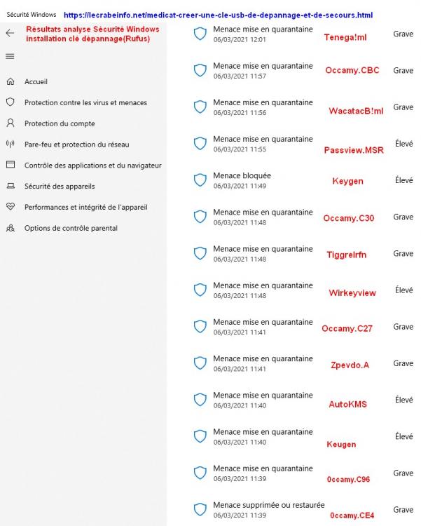 Bonsoir Merci à Calisto06 et à Christian-S pour leurs réponses Je ne pense pas mon ordi infecté car la copie du rapport de la sécurité Windows joint montre qu'elle a bloqué 14 fichiers en cours de téléchargement de la clé (de 11h.39 à 12h.01) Je n'ai pas eu le réflexe de relever les spywares, seulement le premier car je le connais de longue date et je l'ai supprimé. (keygen). Une recherche ne devrais rien donner car elles ont été bloquées Merci de me confirmer la nécessité de la recherche de virus car je suis en cours de récupération des données car mon deuxième DD a été formaté par erreur... (recherche très longue) .Si nécessaire je la ferais demain. P.S. J'ai rajouté les trojans bloqués par Defender -
