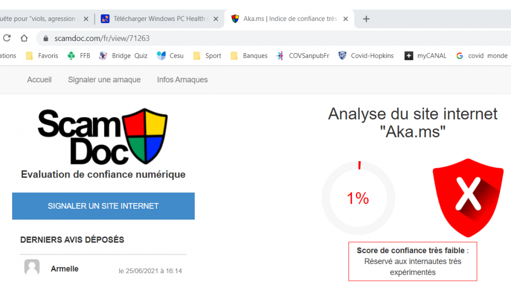 Bonjour à tous Le Crabeinfo serait-il un panier de crabes? La publicité y est omniprésente, ce que je trouve normal pour un site gratuit. Ce que je trouve anormal et même scandaleux c'est qu'il n'y ait aucun filtrage de sécurité et même une certaine complaisance 30 ans d'internet au compteur, quelques centaines d'attaques virus au compteur, j'ai failli me faire avoir pour avoir voulu tester ma compatibilité W11 en utilisant https://lecrabeinfo.net/telecharger/windows-pc-health-check et je me suis retrouvé rapidement sur https://aka.ms/GetPCHealthCheckApp Méfiant de nature (ce n'était pas le site du Crabeinfo, ni celui de Microsoft... j'ai soumis l'adresse à ScamDoc Verdict : 1 % de confiance. Si vous voulez conserver notre confiance montrez-nous vos efforts et filtrez un peu les arnaques. Cela vous coutera quelques annonceurs mais vous apportera beaucoup de clients si vous affichez une telle politique. Cordialement Pra