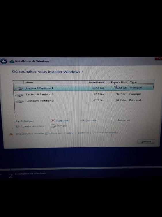 J'ai un Acer Aspire V5-123. Je le démarre (Remarque : Trés long pour démarrer), et je trouve un écran tout noir écrit dessus : "Error loading operating system". Alors, je me suis baladé sur le net, je cherche une solution : Changer de Uefi à legacy dans le bios (déjà Legacy), enlever tous les péréphériques externes, mettre du sel au dessus de l'ordi ... bref j'ai tout essayé. La dernière solution qui m'a sauvé plusieurs fois et de réinstaller windows. J'ai donc téléchargé (illégalement bien sûr ;)) un iso que jai rendu bootable sur un usb, jai booté sur l'usb et là je trouve qu'il y'a 3 partitions dont une est reservée mais on s'en fout et aprés la selection de la partition il ya une erreur (je me souviens qu'il disait que les fichiers dans le cd dinstallation sont corrompus) alors je réessaye je trouve un seul lecteur "lecteur 0 espace non alloué" bref c'est le bordel.
