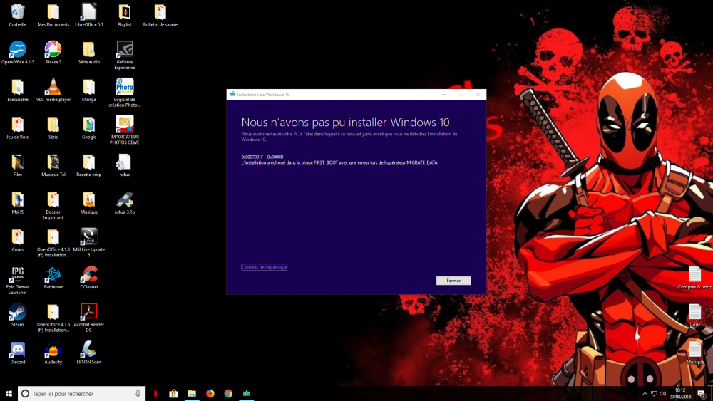 7. J'ai tout essayé, j'ai bien vérifié le bios (uefi ou legacy) refait la clé plusieurs fois, suivi à la lettre ton 1er poste rien y fait, je retombe toujours sur la la phrase : "Windows restaure la version antérieur" et en me connectant sur le compte utilisateur je retombe sur la pop up Windows qui me dit qu'il y a une erreur.