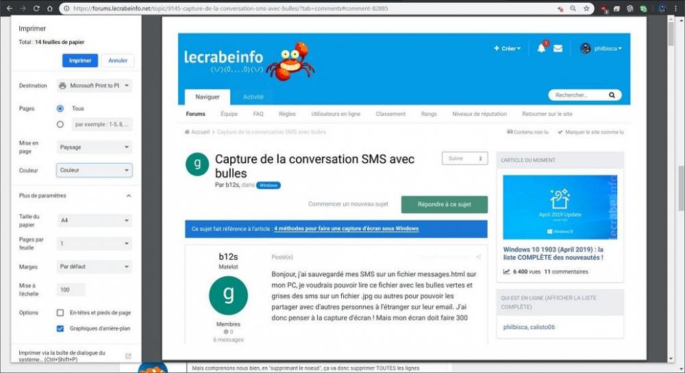 Bonsoir, bé comme je t'expliquais, puisque tu l'ouvres avec un tableur, c'est parfait, tu ne gardes que les conversations que tu veux partager, et tu enregistres ce fichier sous un autre nom, et tu l'envoies aux personnes concernées.... Elles pourront lire la conversation en intégralité, avec la même mise en forme, et ça sera plus agréable que de consulter une multitude de jpegs.... En revanche, je suppose que tu dois avoir aussi un fichier .xsl dans le même répertoire que ton fichier .html, c'est lui qui contient toute la mise en forme, donc, si tu envoies ton fichier .html, penses également à y inclure ce fichier .xsl...