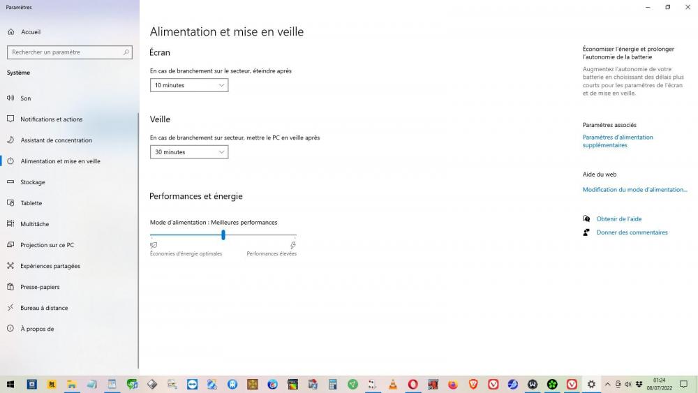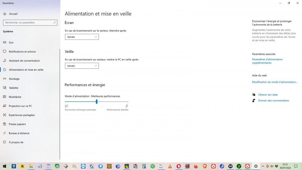 Bonjour, j'ai un petit problème que je n'arrive pas à résoudre. Quand mon PC est allumé et que je suis un certain temps sans l'utiliser, il se met en veille, mon écran de veille est un aquarium que j'ai télécharger depuis pas mal de temps et qui est très réaliste. Le problème c'est que régulièrement, au lieu que mon écran de veille se lance, mon écran s'éteint et je suis obligé de retourner dans les paramètres pour rechanger les valeurs. Donc, clic gauche depuis le bureau, je sélectionne paramètre d'affichage, alimentation et mise en veille, dans écran, en cas de branchement sur secteur, éteindre après 10 mn. Je change la valeur et je met jamais. Dans veille ,en cas de branchement sur secteur, mettre le pc en veille après 30 mn, je met jamais. et je quitte la page des paramètres. Mais tout les deux ou trois jours, je suis obligé de refaire la manip car les valeurs des paramètres d'alimentation se sont remis par défaut. J'aimerais savoir si il y a un moyen de faire en sorte que mes valeurs reste telle que je les aient mis Merci d'avance