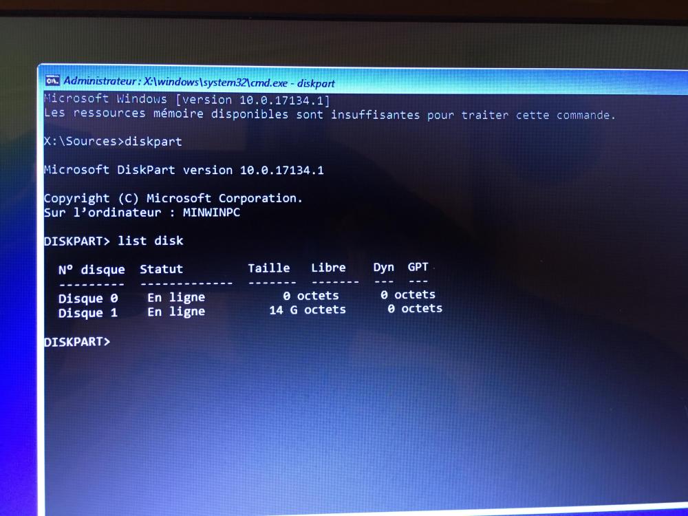 7. Bonsoir, Je viens vous embêter après avoir pris assez l’après-midi à mater des vidéos ou des articles tout ça sur l’installation de w10. le DD de mon pc a lâché cette semaine. N’ayant pas envie d’investir énormément j’ai été au cash du coin prendre un disque dur d’occaz. Apres avoir recup une clee boot de w7 j’ai remarqué que j’avais pas accès à ma carte réseaux etn’ayant Pas d’autre pic sous la main pour aller chercher les pilotes. J’ai installer ubuntu qui lui a tout de suite fonctionner. J’ai ensuite télécharger et créer une clee boot de w10 pour repasser dessus. Mais la ćest la galère il voit le dd mais avec un espace de 0octet de dispo. J’ai essayé avec diskpart rien y fait... alors que diskpart w7 (en mode legacy dans le bios voit totalement le disque w10 (en mode UEFI et secure boot désactivé) nan... je je ne sais plus trop quoi faire si vous avez une idée ? merci