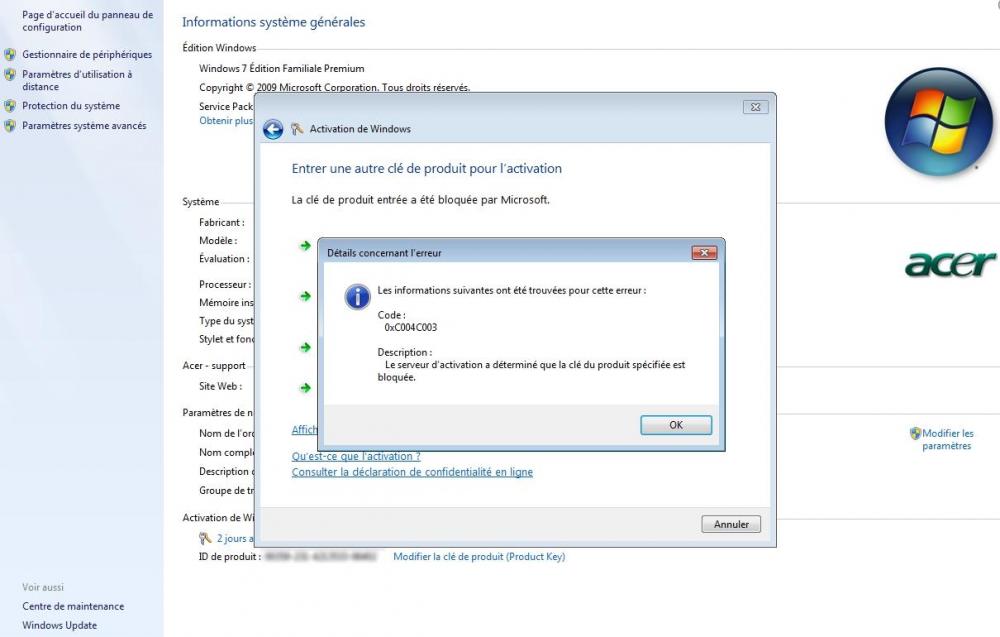Bonjour, une de mes machines ( PC Acer ) qui fonctionnait sous Windows 7 x64 Home Premium version OEM a rendu l'âme. Bien que mes autres PC fonctionnent tous sous Windows 10, j'ai conservé ce PC sous Windows 7 pour pouvoir continuer à utiliser un logiciel spécifique, qui m'est indispensable, et n'est plus disponible depuis une dizaine d'année. Je n'ai pas gardé le fichier d'installation de ce dernier. Par contre j'ai toujours une sauvegarde image de cette machine sous Windows 7. J'ai donc assemblé une nouvelle machine, j'ai acheté une nouvelle licence de la même version de Windows 7 (OEM également) pour rester dans la légalité, et l'installation et l'activation se sont déroulés sans problème sur ce nouveau PC. J'ai ensuite effectué une restauration de l'ancien système (PC Acer) vers la nouvelle machine à partir de l'image disque sauvegardée. La restauration s'est bien déroulée, avec l'ajout des nouveaux drivers (CM ,Sata) au démarrage, et la suppression des anciens pilotes devenus inutiles. Le système est complètement fonctionnel et restauré, et je retrouve la possibilité d'utiliser à nouveau mon logiciel. Mon problème est que je ne peux pas activer ce Windows 7 restauré avec la nouvelle clef OEM (25 chiffres) Windows considérant, à juste titre, que cette clef est déjà utilisée (par moi même en effet) sur un autre PC (le nouveau en effet au moment de l'installation et avant la restauration de l'ancienne image disque) En effet en restaurant le système avec une image disque complète, Windows considère que c'est une machine différente, et donc me laisse 30 jours pour activer mon système : ce que je ne peux faire pour les raisons exposées ci dessus. Donc comment résoudre ce problème : restauration d'une image disque complète d'un système Windows OEM sur un matériel différent disposant aussi d'une licence OEM toute neuve... Est ce que la solution existe qui me permettrait, même en achetant encore une autre licence Windows, de conserver mon système actuel fonctionnel et activé ?