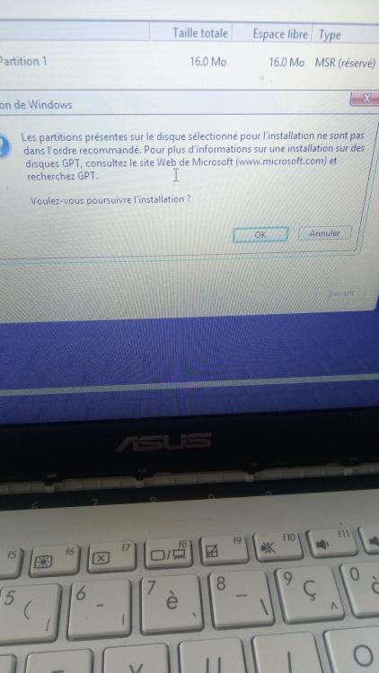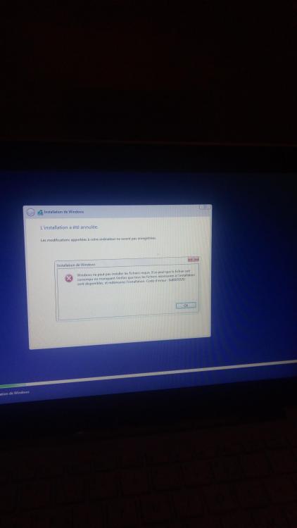 2. Bonjour, Je n'arrive pas à installer Windows 8.1 sur mon ASUS E200H (un notebook) et ce, avec tous les Windows alors que je prend leurs ISO depuis le Windows ISO Downloader.. J'ai 2 erreurs qui reviennent : Pour les Windows créer à partir du Windows Media Creation Tool, après les trucs de partitions de disque, la copie des fichiers se fait mais l'étape d'après "préparation des fichiers d'installation" je crois, ça se bloque à un chiffre et me dit que Windows ne peut pas installer les fichiers requis et ça pour le Windows 8.1 et le 10. Pour le Windows 7 aussi téléchargé sur Windows ISO Downloader : il reste bloqué à "starting Windows" et une sorte de bandeau rouge apparaît en haut de l'écran Autre chose : j'ai suivi ce tuto pour Windows 10 mais une fois que l'ordi bootait, au moment de l'installation ils me parlaient de périphérique manquant, j'avais beau mettre "parcourir" je ne trouvait rien alors que l'installation de Windows était dans ma clé (efi, boot, bootmgr, etc..) je me suis donc rendue sur le site "Driver Pack Solution" afin d'intégrer les fichiers .exe des drivers (avec l’icône de puce principalement) dans la clé USB mais rien n'a changé. Pour l'ISO de Windows 8.1 téléchargé sur Windows ISO Downloader, j'ai eu l'erreur, après les trucs de partitions "Les partitions présentes sur le disque sélectionné ne sont pas dans l'ordre recommandé. Pour plus d'informations sur une installation sur des disques GPT, consultez le site web de Microsoft[...]" on peut poursuivre l'installation magré tout alors je clique sur "continuer" mais j'ai l'erreur "Windows ne peut pas installer les fichiers requis [...]" à l'étape "préparation des fichiers pour l'installation" J'ai tout essayé : retirer la sécurité dans le BIOS, restaurer les paramètres par défaut mais rien n'y fait.. PS : Le disque dur interne (et seul disque dur que j'ai, d'ailleurs), n'apparaît plus dans le BIOS et je n'ai plus le Windows qui était installé avant dans le PC.. Voilà les photos des erreurs dont je vous parle : Merci, par avance, de vos réponses.