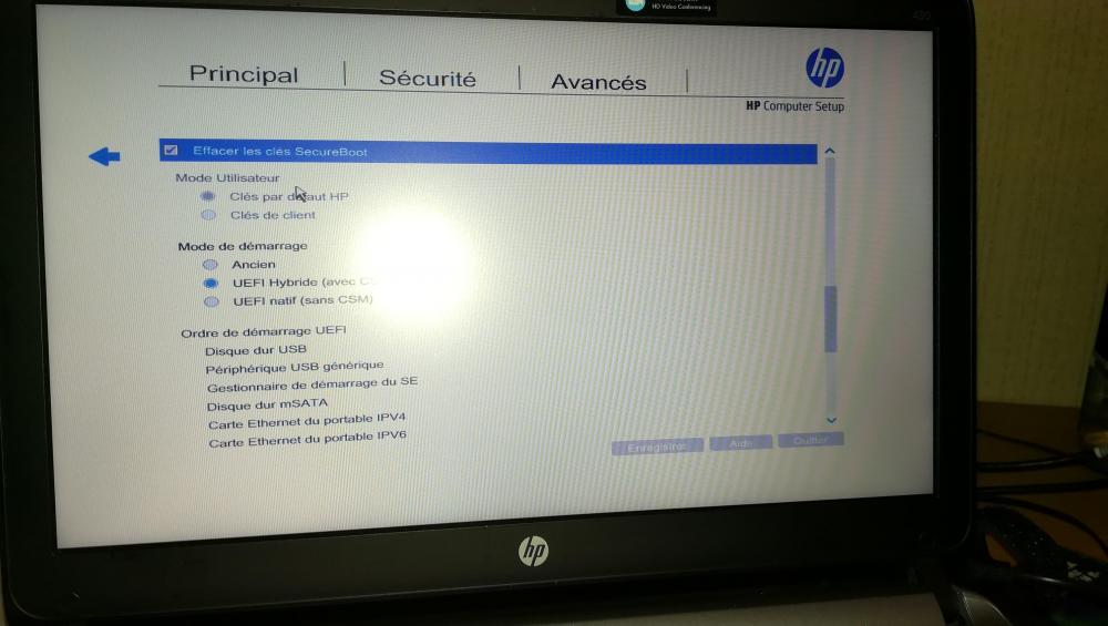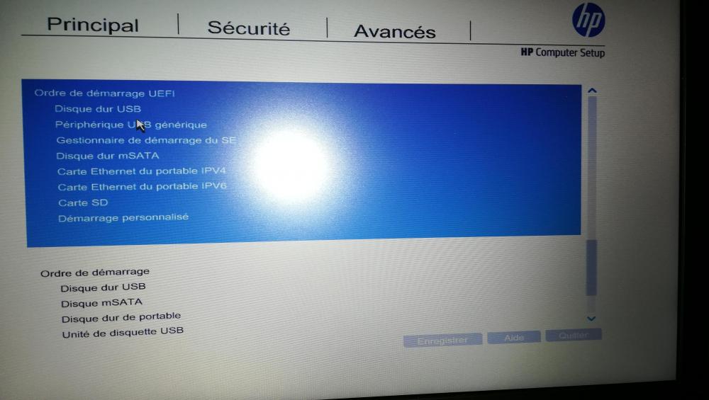 11. Bonjour, J'ai un HP Probook 430 G2, avec windows 10. J'ai créé une clé USB bootable Ubuntu 18.04 Unity 06.07.2018 (que j'ai trouvé sur ce même forum du crabe). Je n'arrive pas à booter sur la clé (alors qu'elle démarre impec sur un ordre ordi, donc elle "marche"). Que ce soit en choisissant la clé dans les options du périphérique de démarrage (F9) ou en entrant dans la configuration du BIOS (F10) ou j'ai mis le disque dur USB en haut (ordre de démarrage UEFI et ordre de démarrage, voir photos ci-jointes), je n'arrive pas à booter sur la clé USB. Si quelqu'un veut bien m'aider... merci d'avance ! Cordialement, Antton