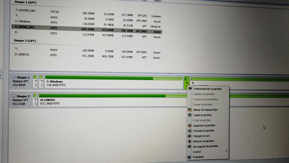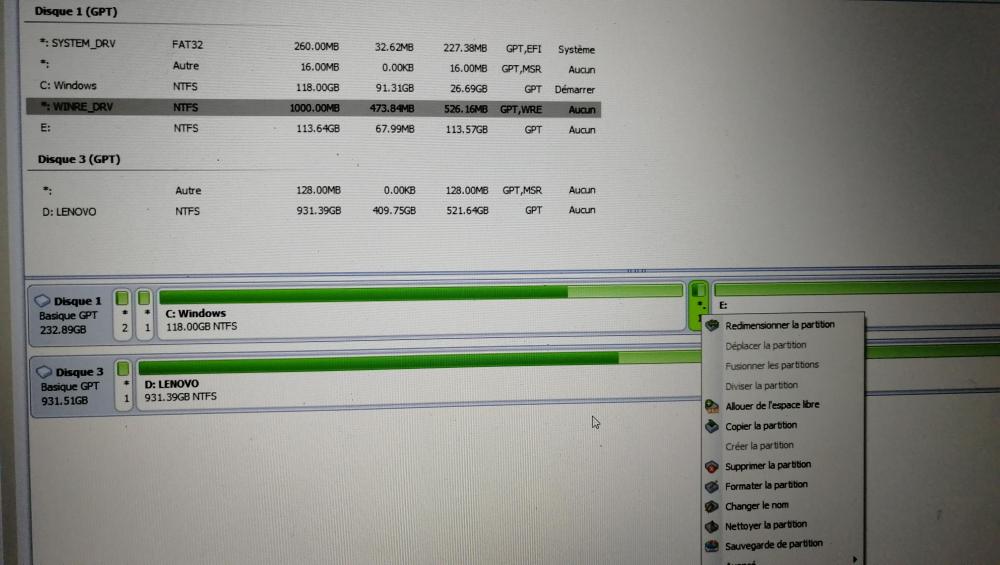 5. Bon, avec AOMEI, impossible de déplacer ou fusionner la partition WINRE_DRV. Pareil pour la C et la E. À mon avis, il faut la version pro pour pouvoir le faire.