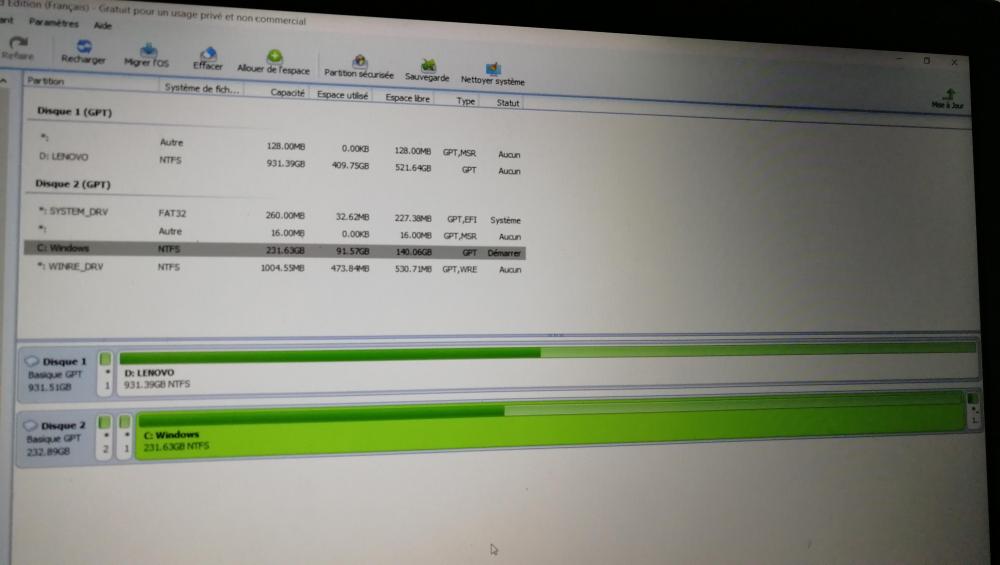 11. Bonjour à tous, Je viens chercher un peu d'aide car j'ai un souci de partition suite au clonage par une image iso faite par Windows d'un SSD 128 Go à un SSD 256 Go. Je m'explique : 1/ j'ai fait mon image iso du système via windows (comme indiqué ici) 2/ je l'ai cloné sur mon SSD 256 Go (comme indiqué ici) Mon problème est que ça a gardé la taille de mon 1er disque (128 Go) et j'ai une autre partition vide d'une centaine de Go que je peux activer. Mon disque C, donc, ne fait pas 256 Go et je ne peux même pas l'étendre pour prendre les Go restants. J'ai du louper quelque chose mais quoi ? Merci de votre aide...