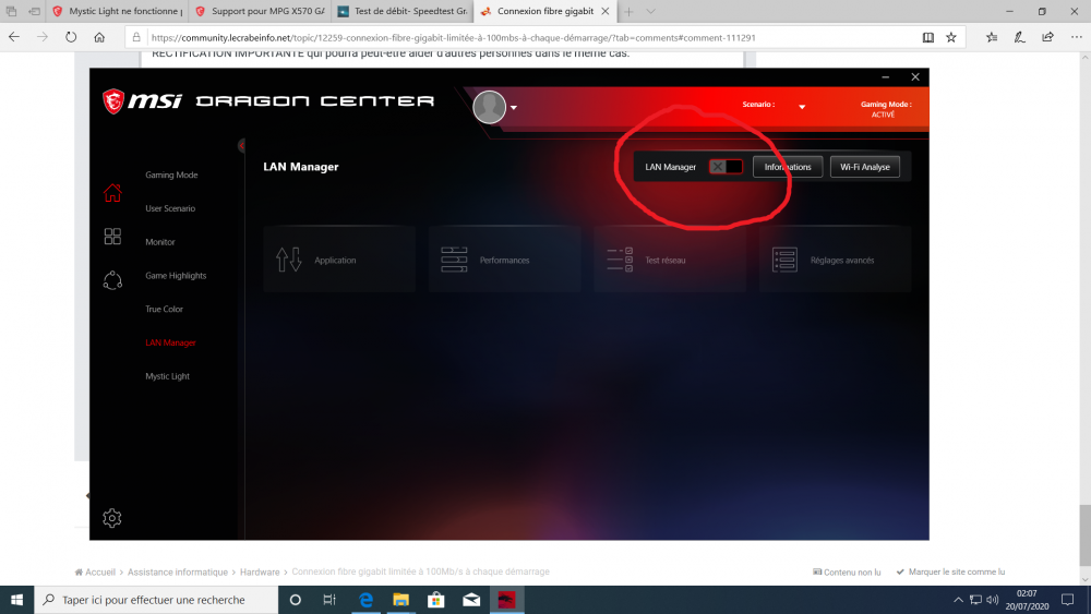 5. RECTIFICATION IMPORTANTE qui pourra peut-être aider d'autres personnes dans le même cas: Ce n'est pas le fait d'avoir réinstallé Windows ni les pilotes de la carte réseau qui ont résolu le problème de bridage de ma connexion (désolé mr Billou gates), le coupable était en fait le logiciel Dragon Center de MSI et son Lan Manager. je me retrouvais avec le problème de limitation de bande passante à chaque fois que j'installais dragon center qui charge des modules tels que mystic light pour le contrôle RGB de la carte mère et d'autres modules de gestion tels que ce fameux Lan Manager qui est activé par défaut. Le fait de désactiver ce module m'a permis de récupérer ma bande passante et dès que je l'active même en mettant les réglages de débit au max, ce dernier bride complètement ma connexion. Donc pour les possesseurs de cartes mères MSI je vous encourage à désactiver le module Lan manager dans l'utilitaire Dragon center afin de pouvoir profiter de votre connexion maximale ! Voilà , j'espère que cela pourra aider d'autres personnes.