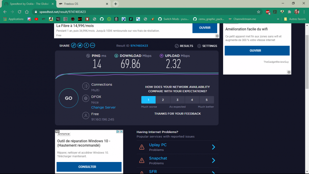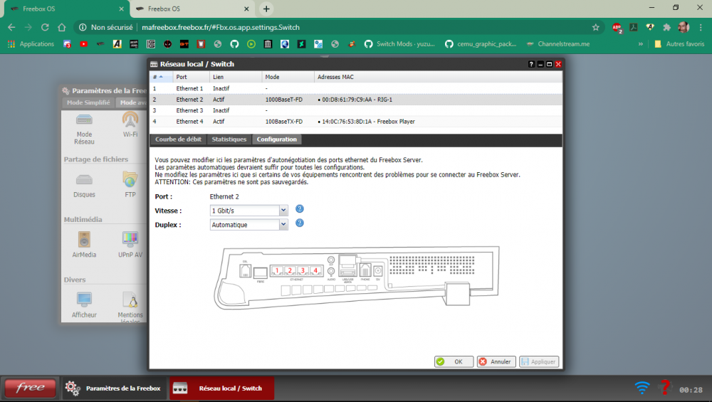 8. Bonjour à toutes et tous. Mon problème brièvement: Je possède une connexion fibre FTTH Free Gigabit (Freebox Révolution V6) et un PC récent qui tourne sous Windows 10 avec une carte controleur ethernet Intel(R) I211 Gigabit Network Connection. A chaque démarrage ou redémarrage du PC les tests de vitesses montrent clairement que la freebox et la carte réseau négocient en 100 Mb/s et pas en 1 Gb/s. j'entend un son de déconnexion de matériel ( comme lorsqu'on déconnecte une clé USB par exemple). Donc mes débits sont de l'ordre de 70 Mb/s en down et 3Mb/s en up. Par contre si je change de port ethernet sur le switch intégré à la freebox je retrouve mes débits "normaux" à savoir 730 Mb/s en down et 50 Mb/s en up environ . Et là si je redémarre le PC, les débits reviennent en 90Mb/s up et 4 Mb/s down. Donc je change de port ethernet et ça redevient normal ...etc. Dans l'interface de gestion du switch Freebox on peut definir le type de négociation entre chaque port ethernet et le matériel connecté ce qui fait qu'en modifiant manuellement le paramètre je retrouve une connexion gigabit full duplex mais dès que je reboot c'est fini. J'ai de même forcé la vitesse à 1 Gb/s dans les propriétés -configuration de ma carte réseau...rien n'y fait, je retombe systématiquement en 100Mb/s au redémarrage suivant.... pour plus de précisions ma config est la suivante: carte mère MSI mpg x570 gaming pro carbon wifi avec wifi Ax et carte controleur ethernet Intel(R) I211 Gigabit Network Connection. cpu AMD Ryzen 5 3600x 16 Gig de DDR4 à 3600 Mhz Windows 10 pro Mes pilotes , mon bios et Windows sont à jour. J'ai redémarré la freebox plusieurs fois afin de la mettre à jour et d'essayer de valider les paramètres de connexion....quedal. J'ai utilisé l'application Intel(R) PROSet Adapter Configuration Utility pour tester mes cables , mon Hardware et la connexion: pilotes,cables et hardware nickel mais connexion impossible parfois puis je refais le test une ou deux fois et tout rentre dans l'ordre....j'en perds mon latin . Je ne sais pas si le soucis vient du Freebox server, de ma carte réseau intégrée ou de windows...ou d'une force surnaturelle maléfique... Je précise que mon pc est branché en direct sur un port ethernet de la freebox avec un cable cat 6 ftp . Je remercie par avance les membres du forum qui liront mon sujet et m'aideront à résoudre ce problème qui est bien chi....
