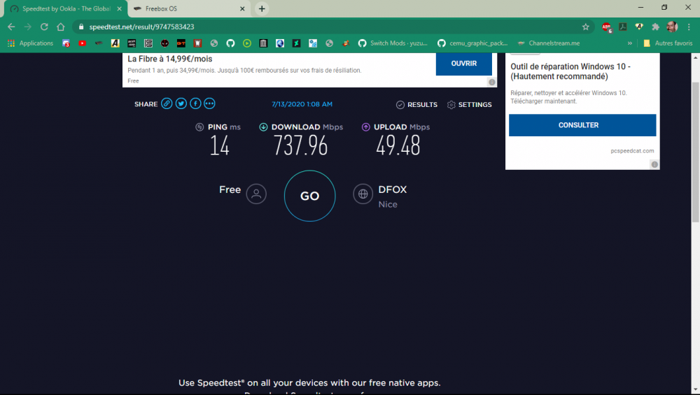 6. Résultat: Problème résolu en réinstallant un Windows 10 pro ver.1903 avec les pilotes Intel d'origine. Le problème venait bien de Windows et non pas de ma Freebox. Je me suis bien fait chi… à essayer de comprendre le problème en réinstallant maintes fois les drivers de la carte réseau et en modifiant tous les paramètres de connexion sur la box et la carte mais au final il semble que ce soit Windows qui créait ce souci. J'ai refait une installation minimale hors réseau et j'ai désactivé les mises à jour de Windows update et là seulement je me suis connecté au réseau: test 850 Mb/s en down et c'est resté à ce niveau de débit même après plusieurs redémarrage . Je viens de créer une image système clean au cas où... Problème résolu! Merci Delta pour avoir répondu à mon sujet .