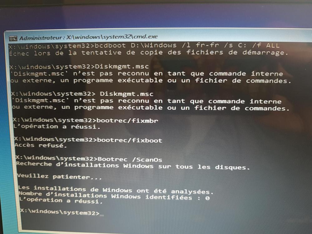 B- REPARATION DU DEMARRAGE (RECONSTRUIRE LE BCD) - Enregistrement de démarrage principal (MBR)- Secteur d'amorçage et Magasin de données de Configuration de démarrage (BCD). Une fois la lettre de la partition OS repérée (dans notre exemple il s'agit de la lettre C), exécuter dans l'ordre les commandes suivantes : bootrec /fixmbr bootrec /fixboot Si le message Accès refusé s'affiche, ignorer cette commande et continuer. Bootrec /ScanOs (À utiliser dans le cas d’un Dual Boot si un système manque dans le menu de démarrage). Et appuyer sur la touche clavier ENTREE. Attendre quelques secondes la recherche d’installations Windows. Si des entrées ne sont pas actuellement dans le magasin BCD, elles seront affichées. Le message : L’opération a réussi doit s’afficher. bootrec /rebuildbcd Le message suivant doit s'afficher : Nombre d'installations Windows identifiées : 1 au lieu de 1 la réponse est 0 Je suis parti sur la suite à savoir la reconstruction intégrale de la BCD et j'ai modifié la lettre du volume C pour le nommer V C- RECONSTRUCTION INTEGRALE DE LA BCD Si la réparation du paragraphe B ci-dessus ne donne pas de résultat, il faut essayer d'effectuer une reconstruction intégrale de la BCD. Pour cela, accéder à nouveau à l'invite de commande en environnement de récupération qui s'ouvre sur : X:\Windows\system32> et exécuter dans l'ordre les commandes suivantes : diskpart list volume Et là, dans la liste des volumes, il faut noter le numéro de volume attribué à la partition réservée du système (partition EFI) au format fat32, dans l'exemple que nous traitons, voilà ce qui est affiché avec la commande list volume : Donc, le volume qui nous intéresse est le volume 5 Exécuter alors les commandes suivantes : select volume 5 assign letter=v Un message sera affiché informant que diskpart a correctement assigné la lettre de lecteur ou le point de montage. - Fermer l’Invite de commande. - Revenir encore une fois à l’invite de commande. Nous avons donc assigné la lettre v à notre partition de démarrage EFI. Fermer l’Invite de commande. - Revenir encore une fois à l’invite de commande qui va s'ouvrir à nouveau sur : X:\Windows\system32> Saisir commande : cd /d v:\EFI\Microsoft\Boot\ Mais je pense que je ne suis pas en mode EFI