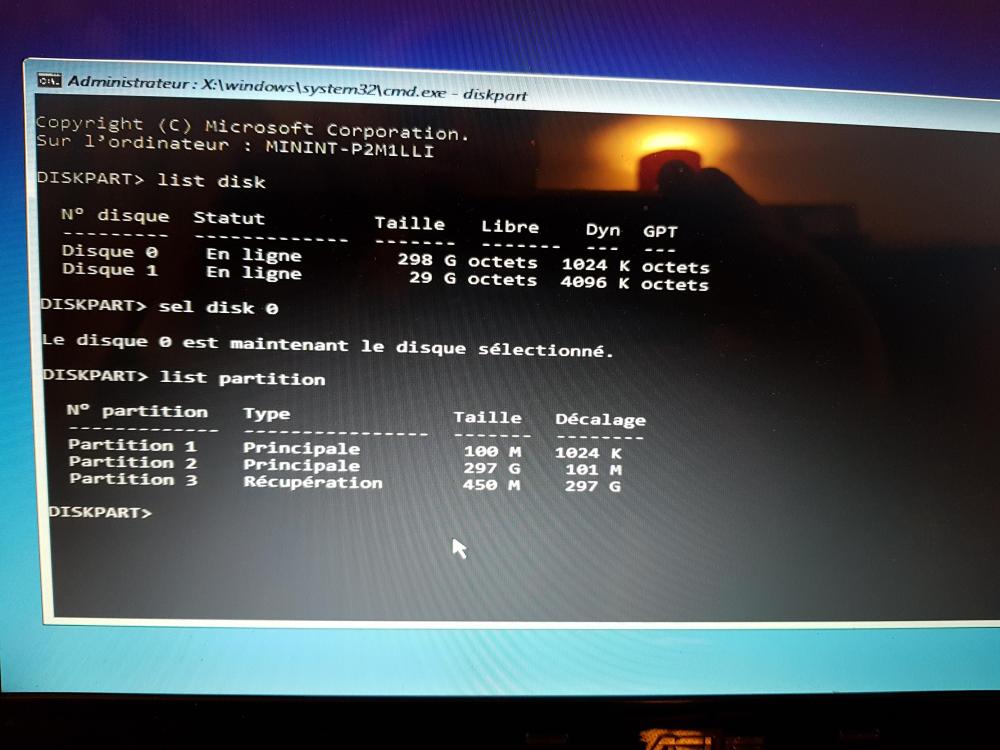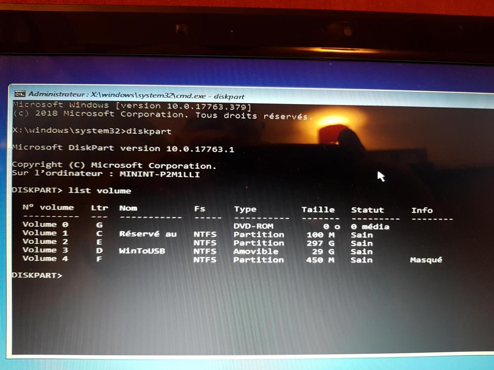 Bonjour Calisto Je t'envoie les captures d'écran des procédures que j'ai effectuées le 16/11 et aujourd'hui. En reprenant la procédure de réparation de C- RECONSTRUCTION INTEGRALE DE LA BCD demandant accéder à nouveau à l'invite de commande en environnement de récupération qui s'ouvre sur : X:\Windows\system32> exécuter dans l'ordre les commandes suivantes : diskpart list volume Je ne vois pas quel est le volume que je dois sélectionner pour reconstruire la BCD. Merci de ton aide Calisto DB93