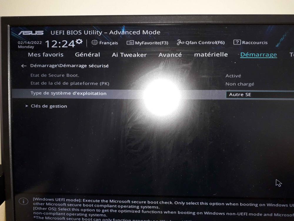 7. Salut Je voulais formater l'ordi de ma mère (pour lui réinstaller Windows 10) avec Ventoy 1.0.66. Mais impossible de booter sur la clé. Je suis allé dans le bios et dans la séquence de démarrage j'ai mis la partition 1 de la clé en premier: Au début je me suis posé la question si c'était la 1 ou la 2. Mais j'imagine que dans la seconde partition il y a les ISOs ? de toute façon j'ai essayé en mettant la seconde mais rien. J'ai voulu désactiver le secure boot mais dans Démarrage je ne peux pas le désactiver et je n'ai pas trouvé où faire ça.