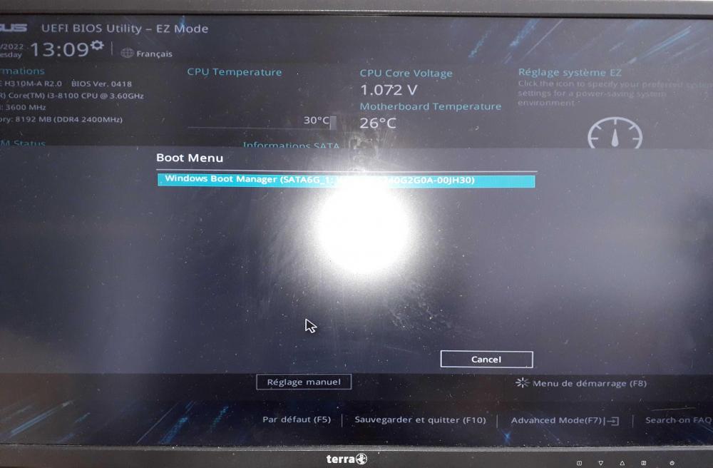 3. Voici une capture d'écran de l'onglet démarrage. En écrivant le message je me demandais si tu voulais avec la clé d'installation insérée ou pas. J'ai fait la capture sans la clé d'installation.