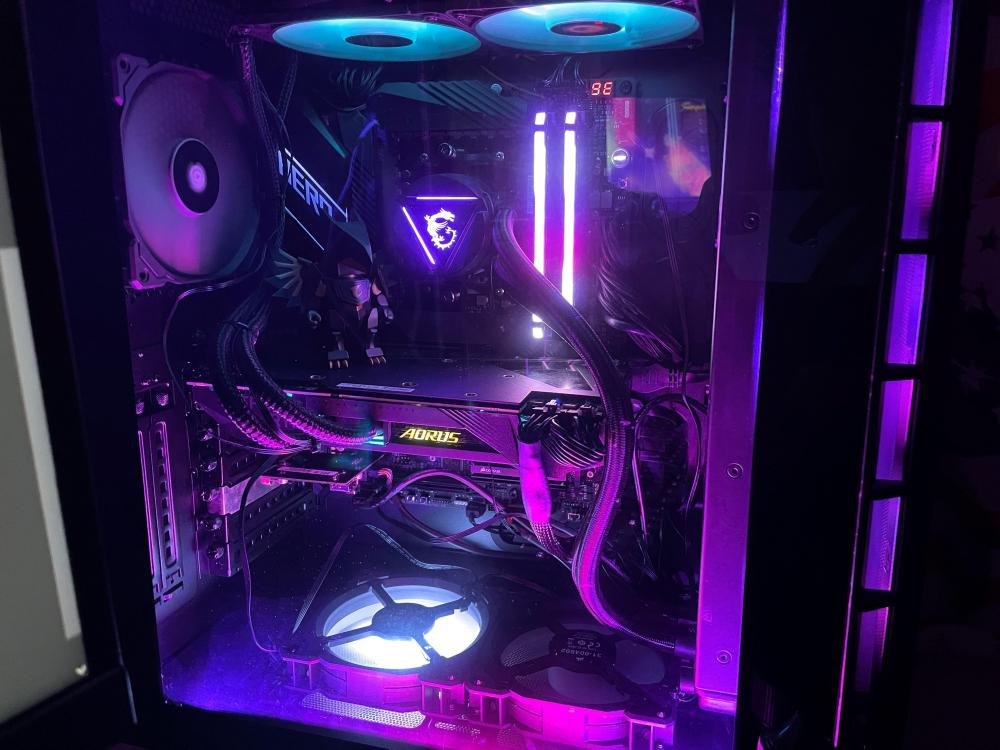 Pour le watercooling: Alors il y'a bien 3 ventilateurs devant le radiateur (photo de la face avant du PC, les trois ventilos RGB en violet) Les deux ventilos bleus sont devant un radiateur du watercooling de la carte graphique Pour le SSD en vrac, en gros j'ai un HDD qui se trouve dans le compartiment des HDD, un SSD fixé au dessus de ce compartiment, et le SSD en vrac est encore un SSD supplémentaire, mais il n'y a aucun emplacement disponible En gros j'ai fixé le watercooling de la carte graphique sur l'emplacement des SSD (et c'est aussi pour ça que j'ai retiré la plaque coté droit, pour avoir une sortie d'air (je comptais découper la plaque mais j'ai eu un problème technique de procrastination ^^') Bref j'ai deux radiateurs, le MSI à l'avant avec 3ventilateurs pour le CPU, et un sur le coté avec 2ventilateurs pour la carte graphique Ensuite pour le flux d'air et les SSD qui n'auraient pas le flux d'air suffisant, tu penses que ce serait la source du problème? Il faudrait que j’achète un boitier qui est adapté pour accueillir 2 radiateurs? En vrai je n'avais pas pensé à ça car j'ai cette configuration depuis fin 2020 (ce setup à été conçus spécialement pour la sortie de Cyberpunk 2077 auquel je voulais absolument jouer en ultra) peut être que neuf ça ne posait pas de problème mais que à l'usure ça devient de plus en plus un problème?