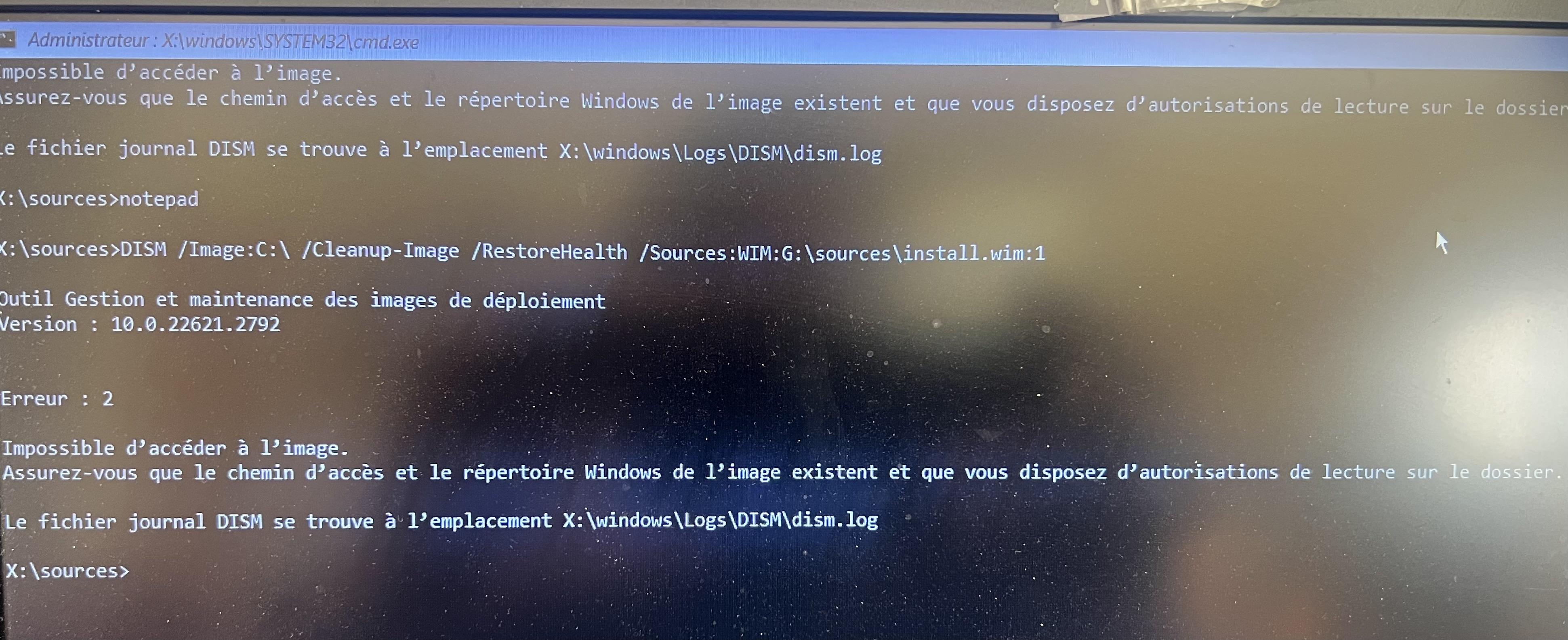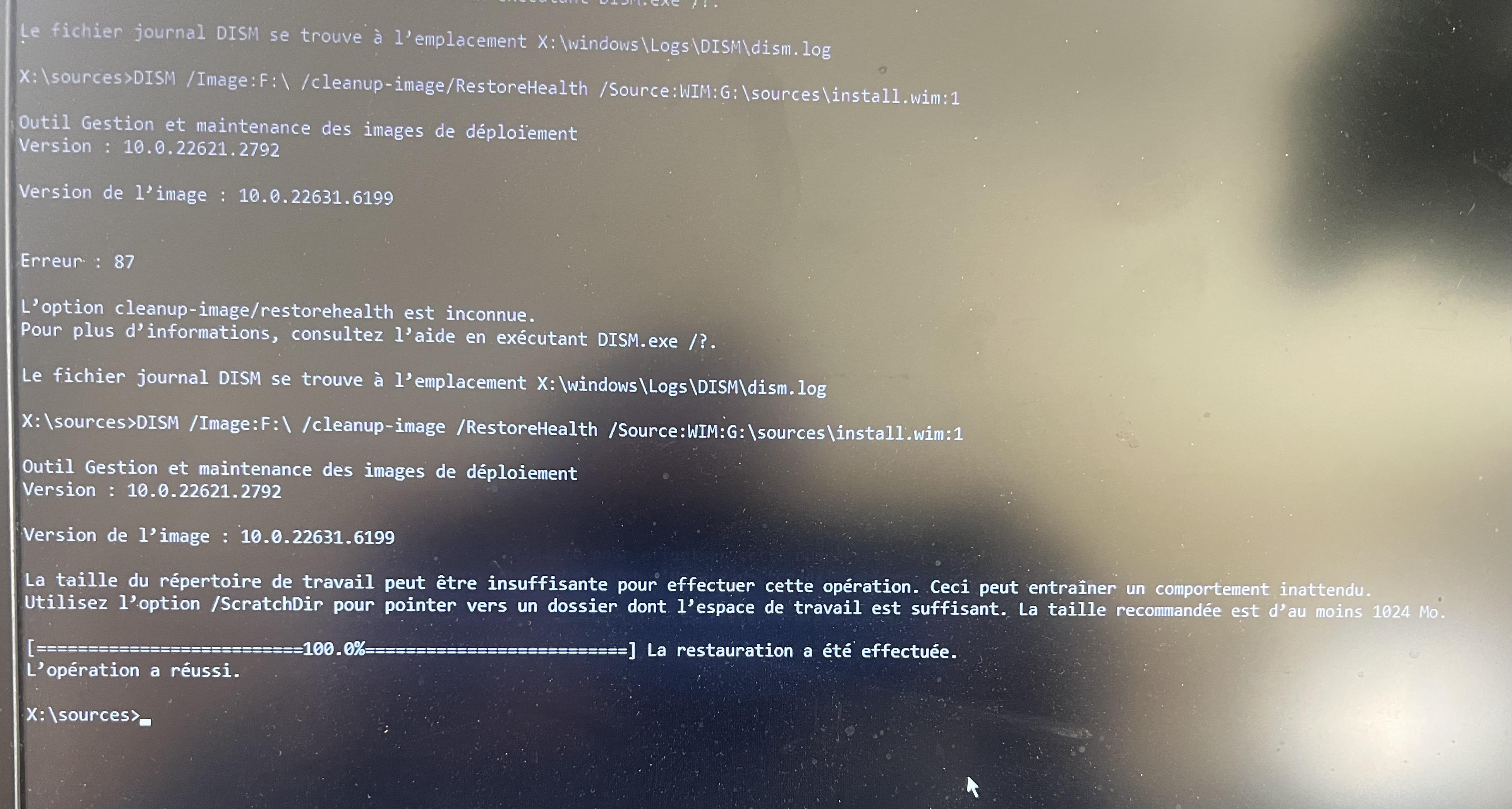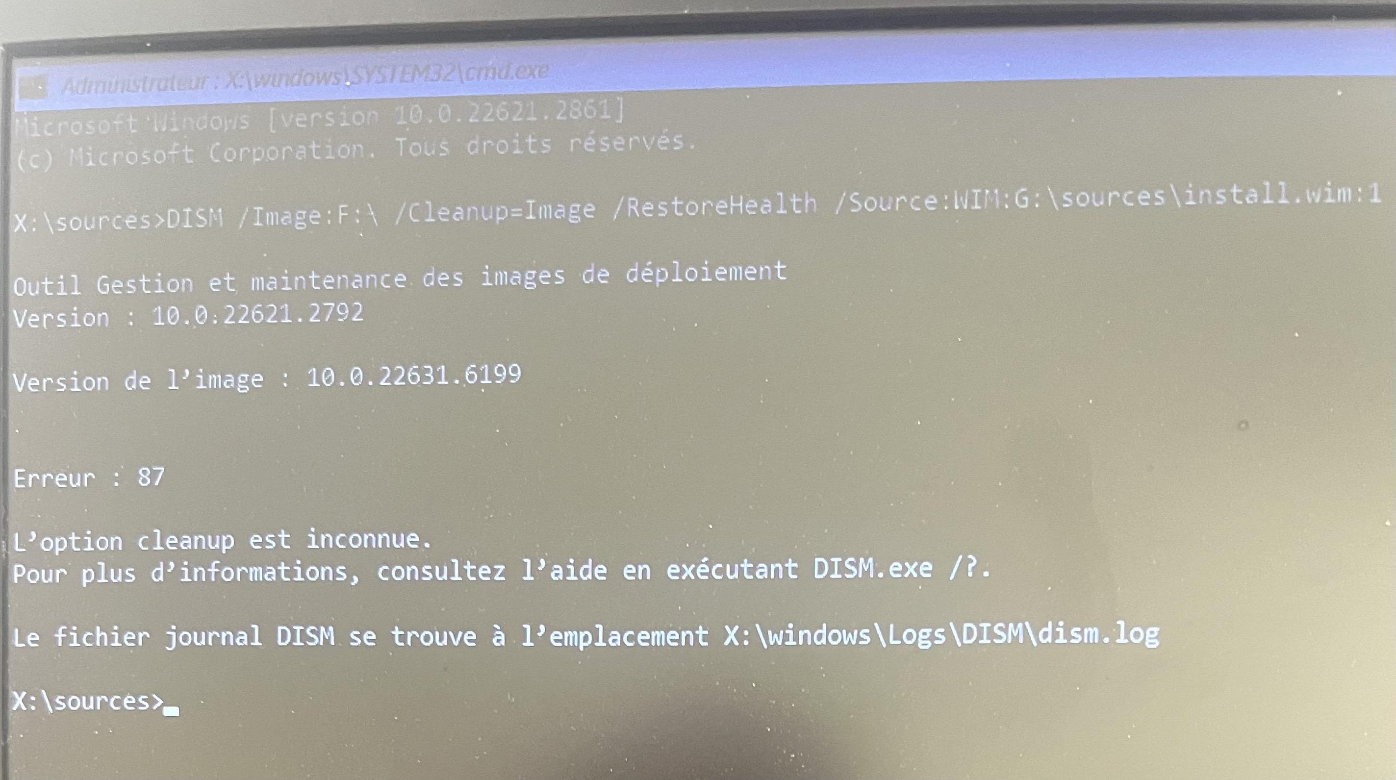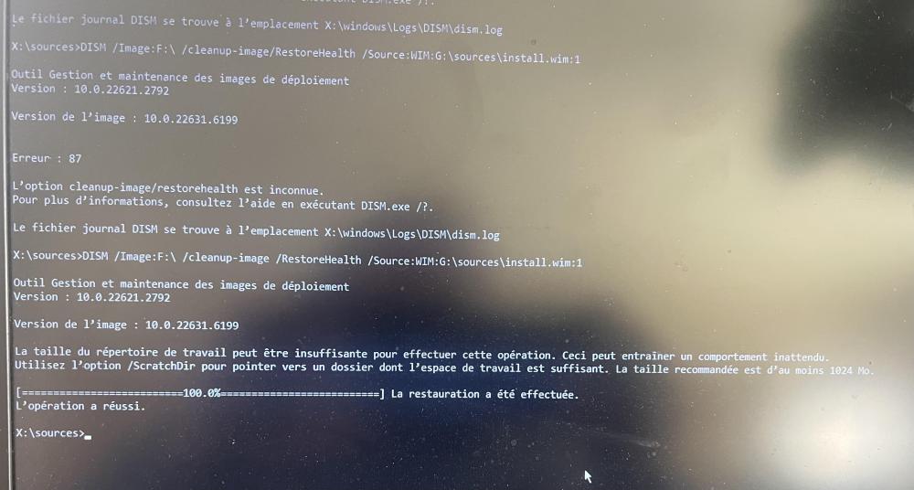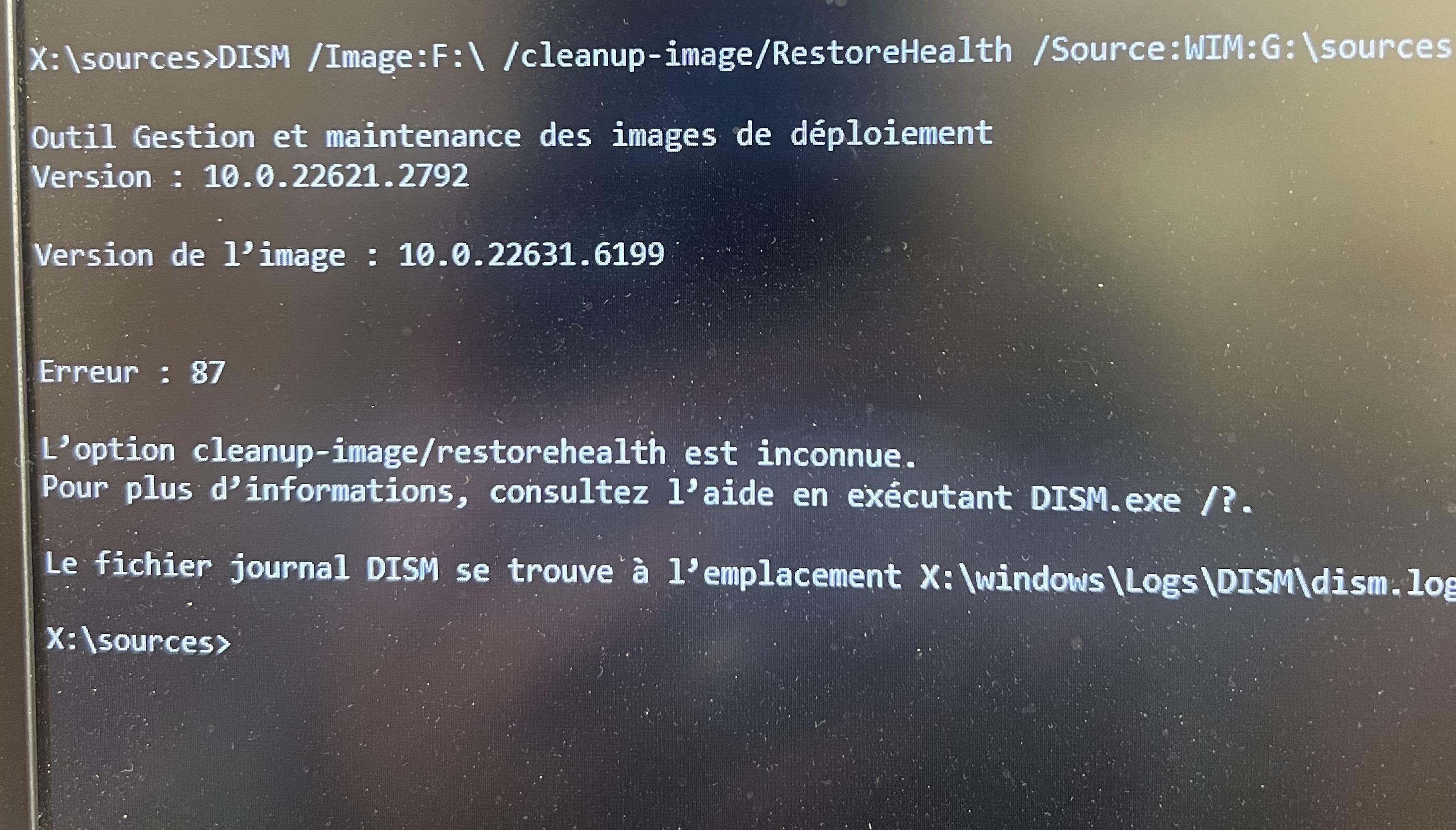 J'ai déconnecté les disques externes, ceux qui reste sont partitionnés. je tape la ligne: DISM /Image:C:\ /Cleanup-Image /RestoreHealth /Source:WIM:G:\sources\install.wim:1 et j'ai toujours une erreur