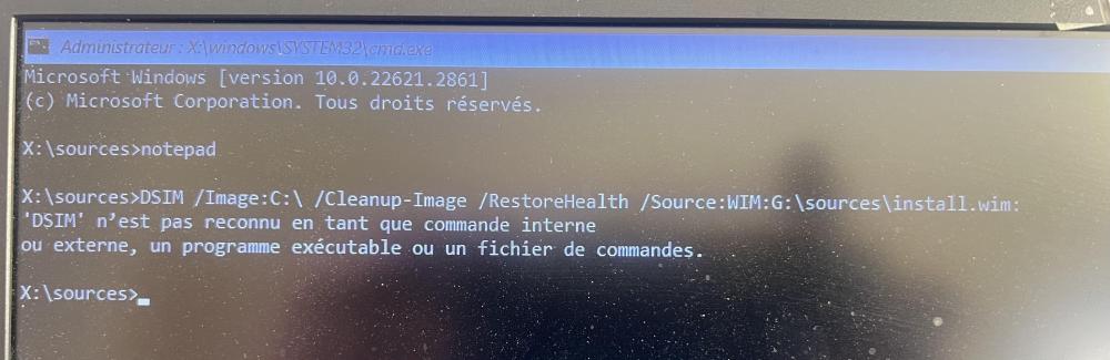 Il s'y trouve. DISM /Image:C:\ /Cleanup-Image /RestoreHealth /Source:WIM:G:\sources\install.wim:1 J'ai toujours une erreur: 2, impossible Impossible d'accéder à l'image. Non. C'est une photo de notepad. J'ai un nouveau problème, le clavier est passé en qwerty