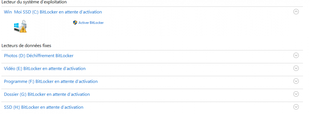 Bonjour, j'ai installé 2 disques dur 1 HHD de To et un SSD 500 Go. j'ai installé windows 10 Pro. sur SSD , tout c'est bien passé. L’orsque je suis allé dans le menu gestion des disque les 2 disques été chiffré bitlocker. Impossible de retirer de chiffrage? Ci-joint une capture . Merci d'avance.
